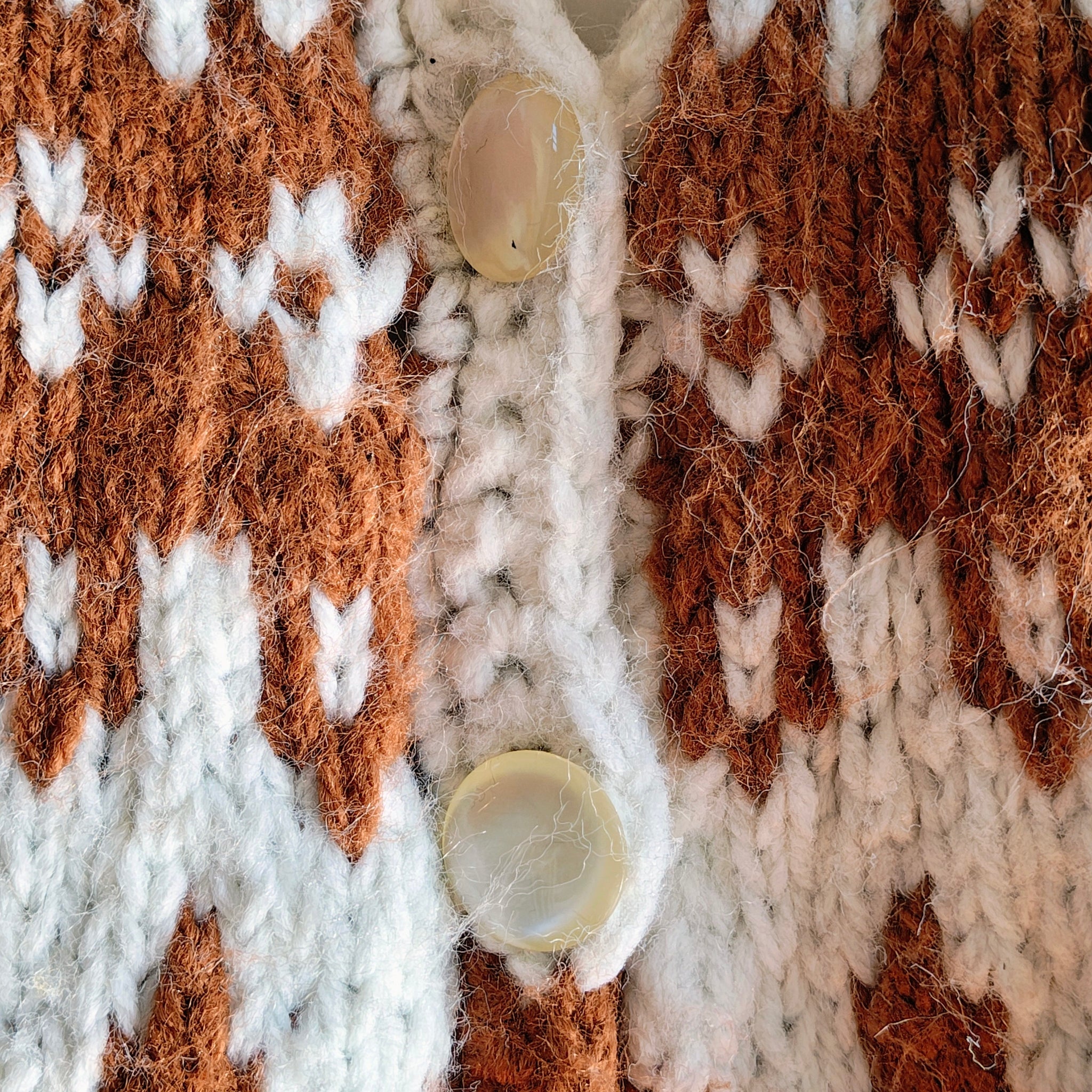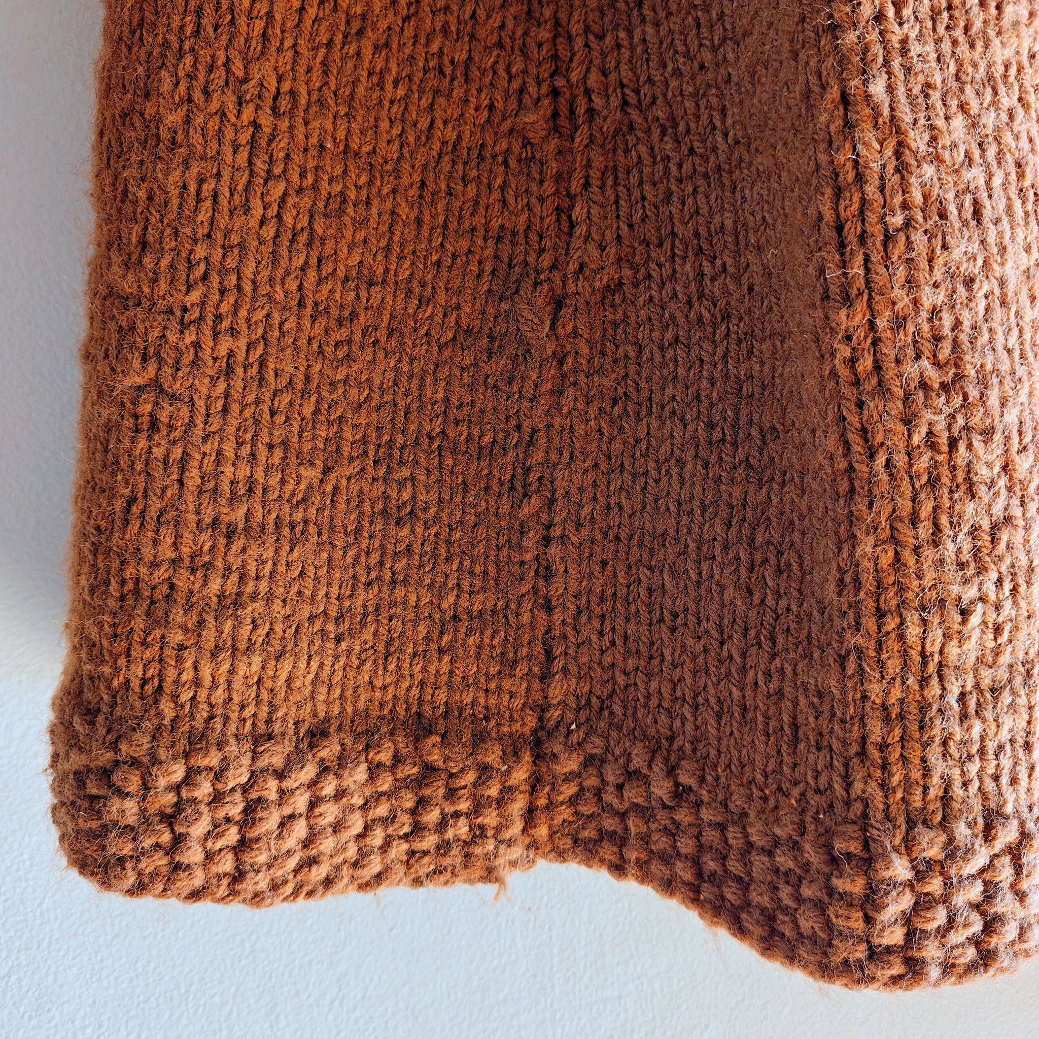 Material: It appears to be made from bulky weight Icelandic wool (known as lopi), which is prized for its warmth, durability, and water-resistant properties due to its unique dual-fiber structure. However, there is no tag so it is unknown.