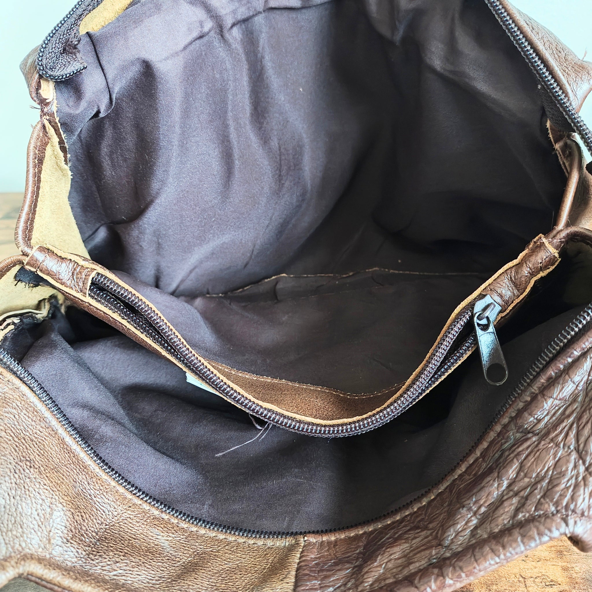 Interior: Two main compartments with third zipper compartment and full zip closure.