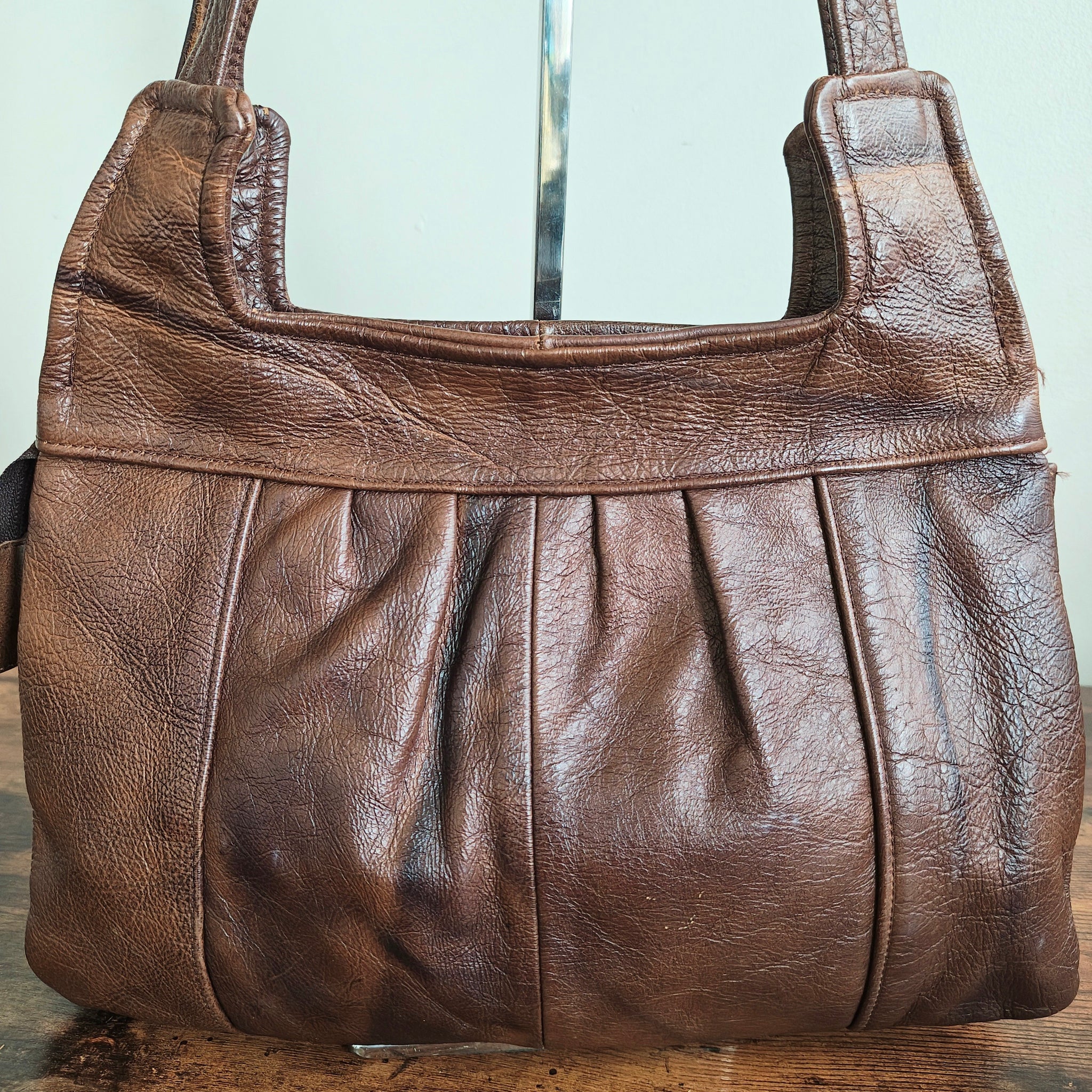 Style: Medium-sized shoulder bag with a zip closure and dual leather handles.