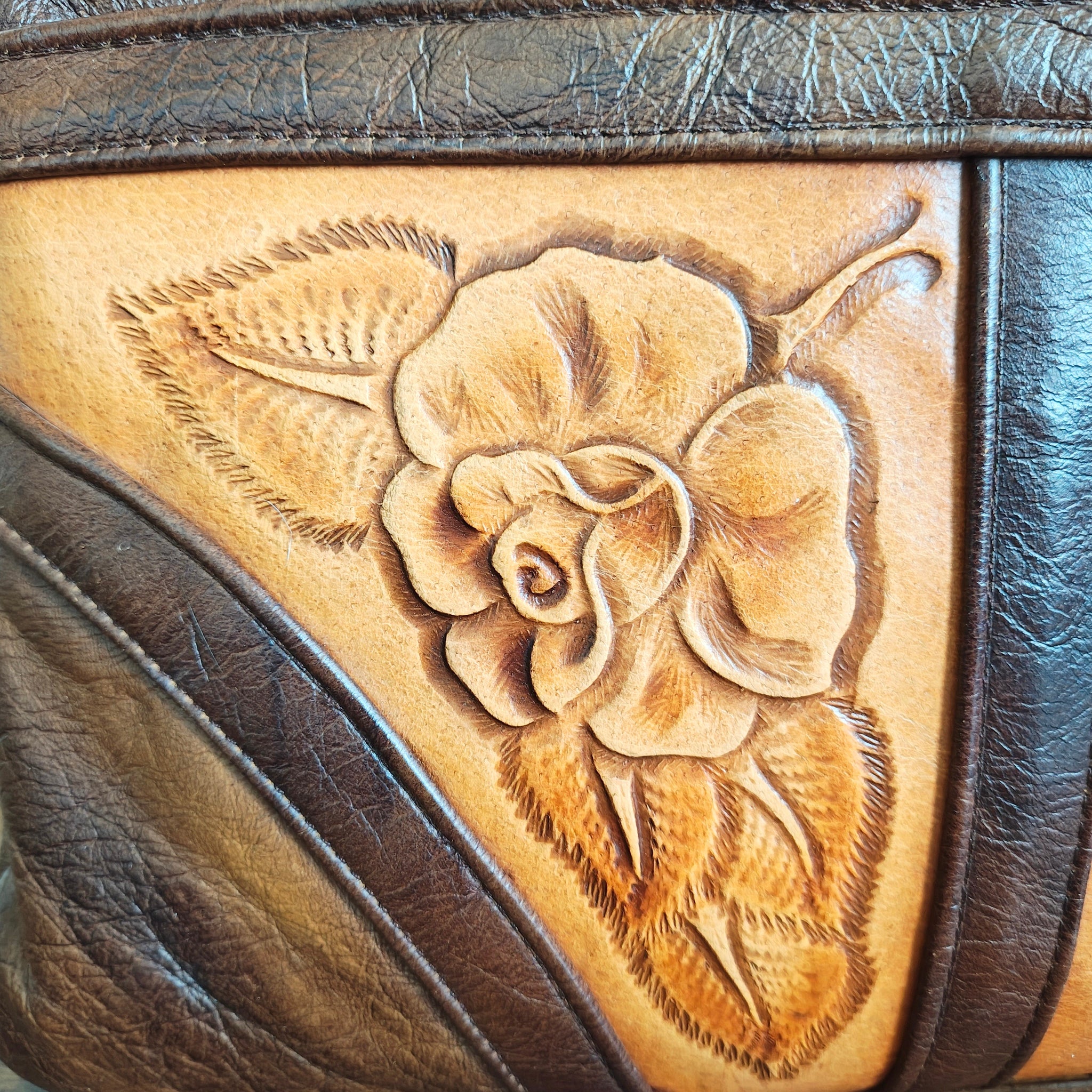 Mexican hand-tooled genuine leather handbag. These bags are known for their intricate floral designs, typically featuring embossed roses, and are crafted using traditional leatherwork techniques from Mexico.