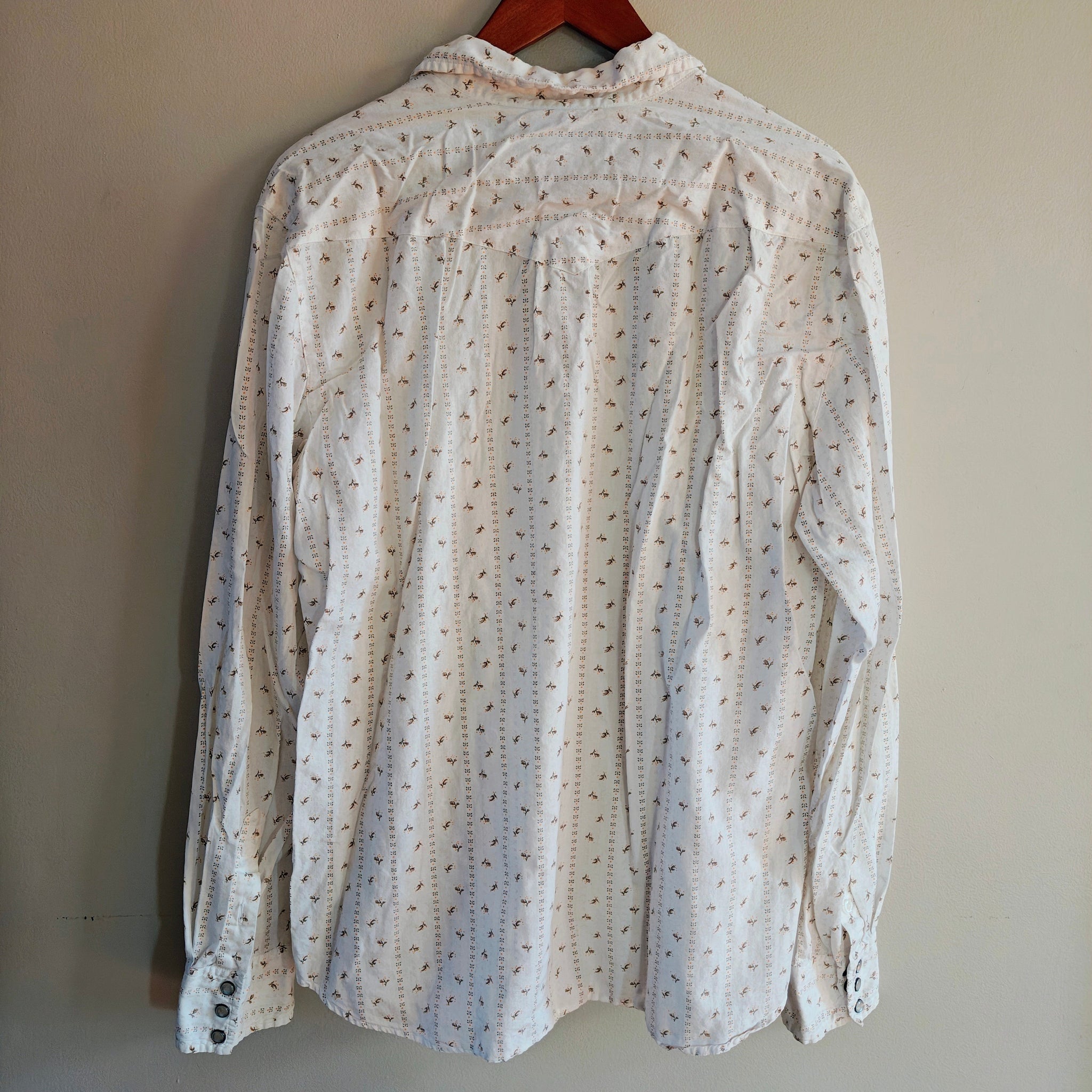 Vintage long-sleeve, button-up Western-style shirt with a pointed collar, two chest pockets, and pearl snap closures.