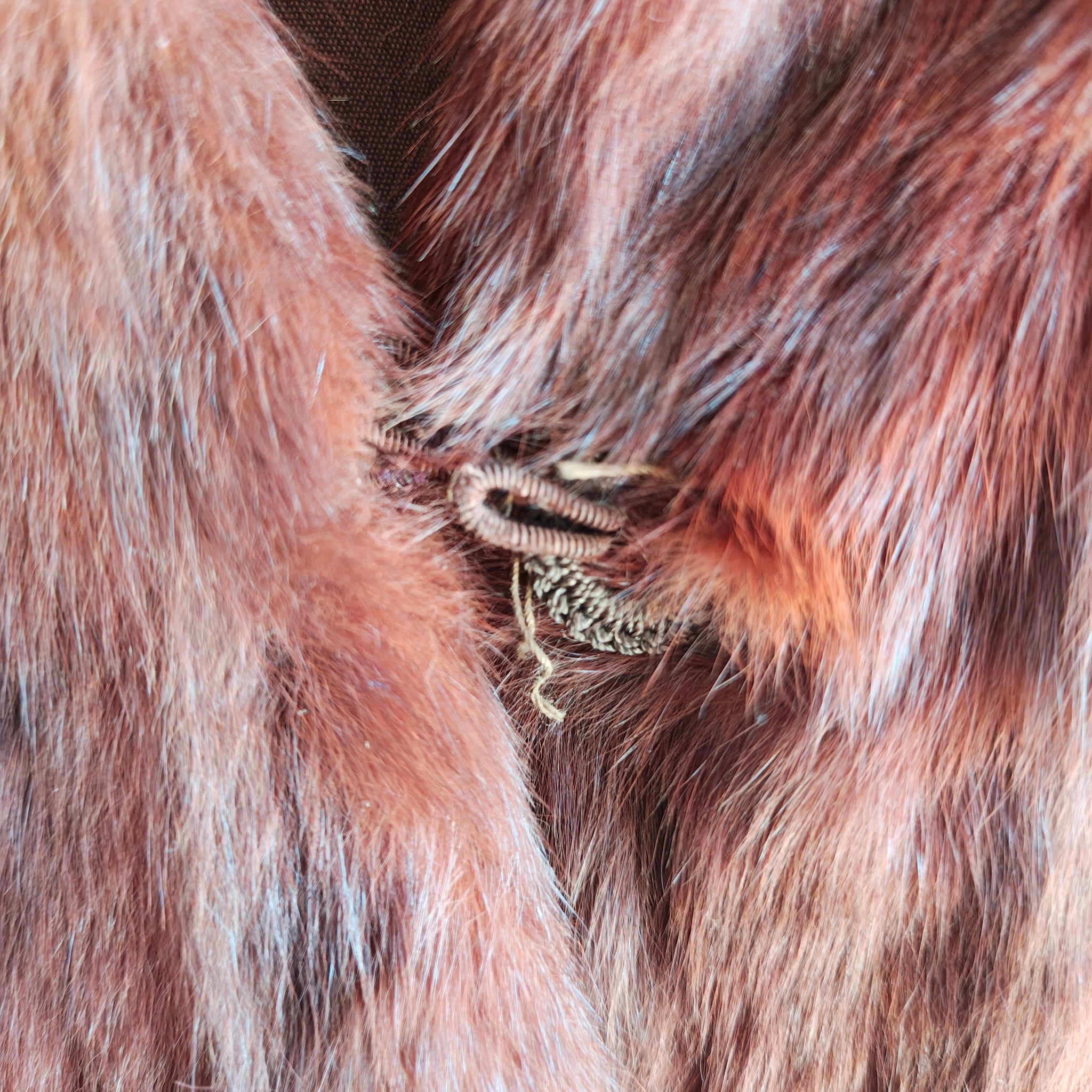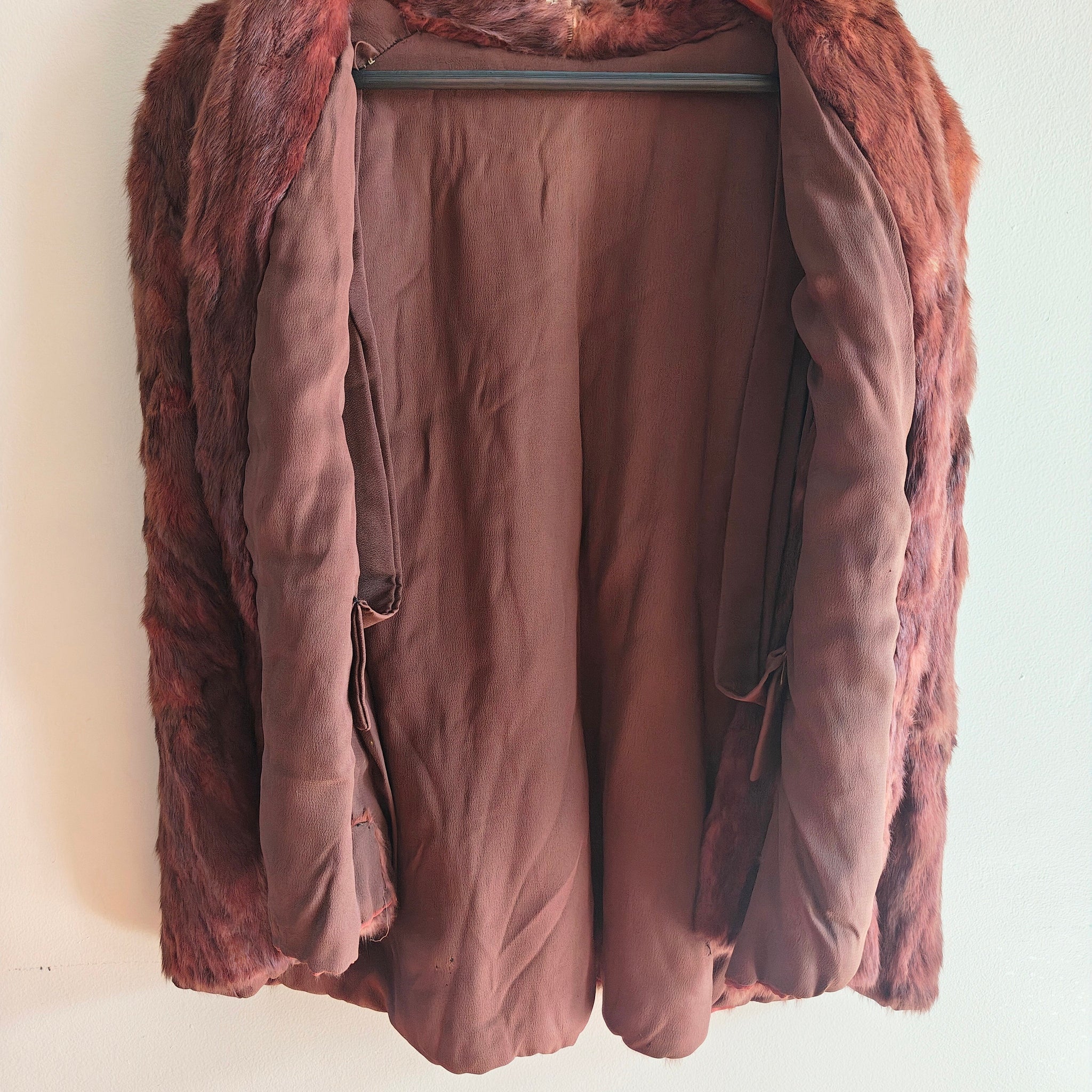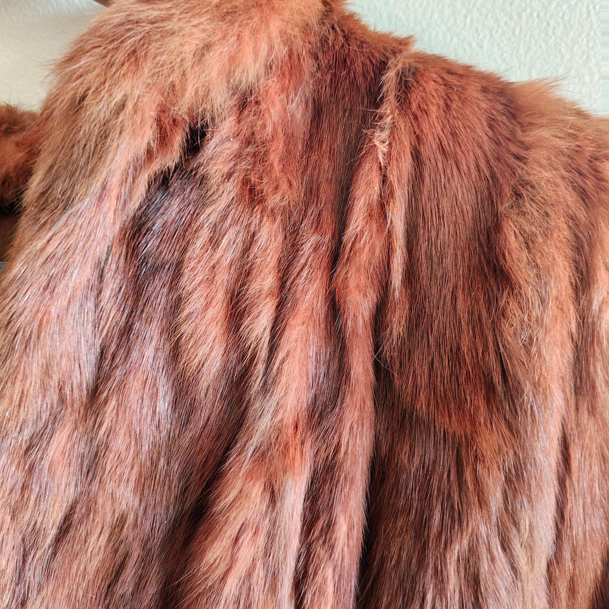 Overall in good condition for it's age. Lining has one area with small moth hole, closure is in tact and functional. Thefur still feels soft and secure and has beautiful shine. There are a few thin spots with balding on the bottom hem, shown in the photos. The interior collar also shows wear and deterioration, which can be easily mended to make them less visible.