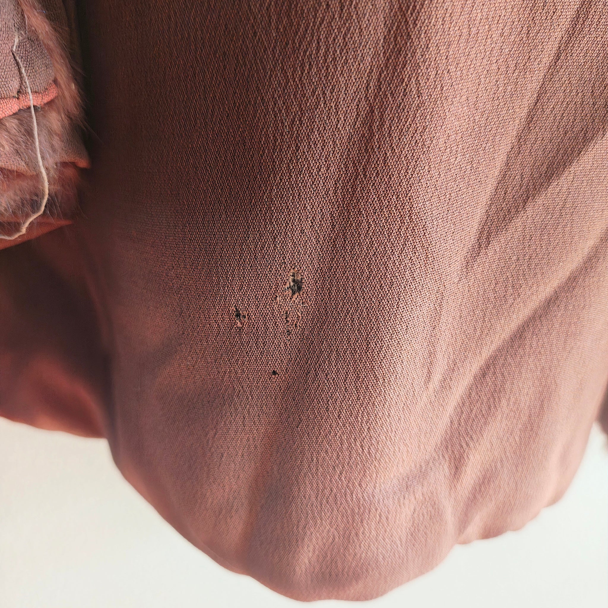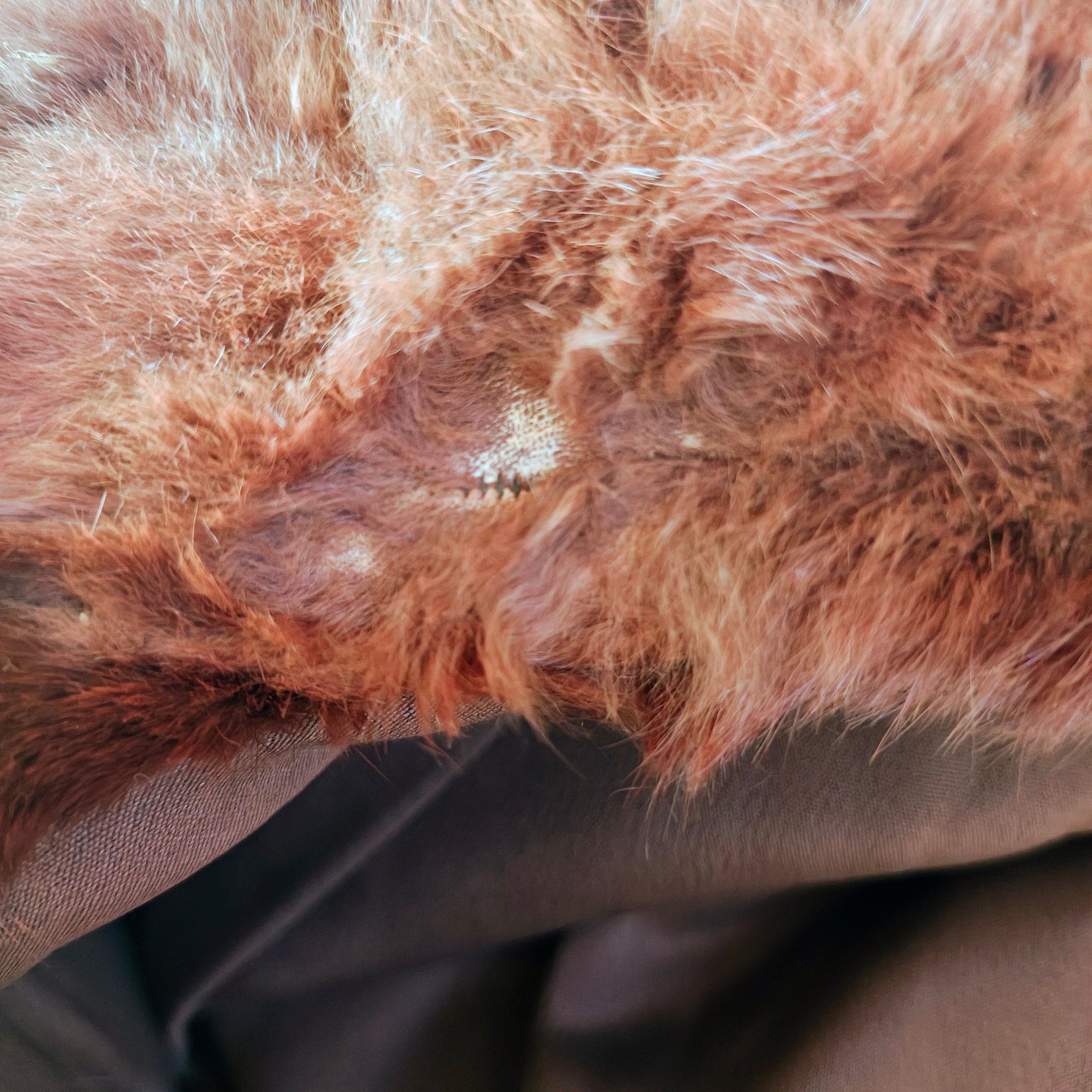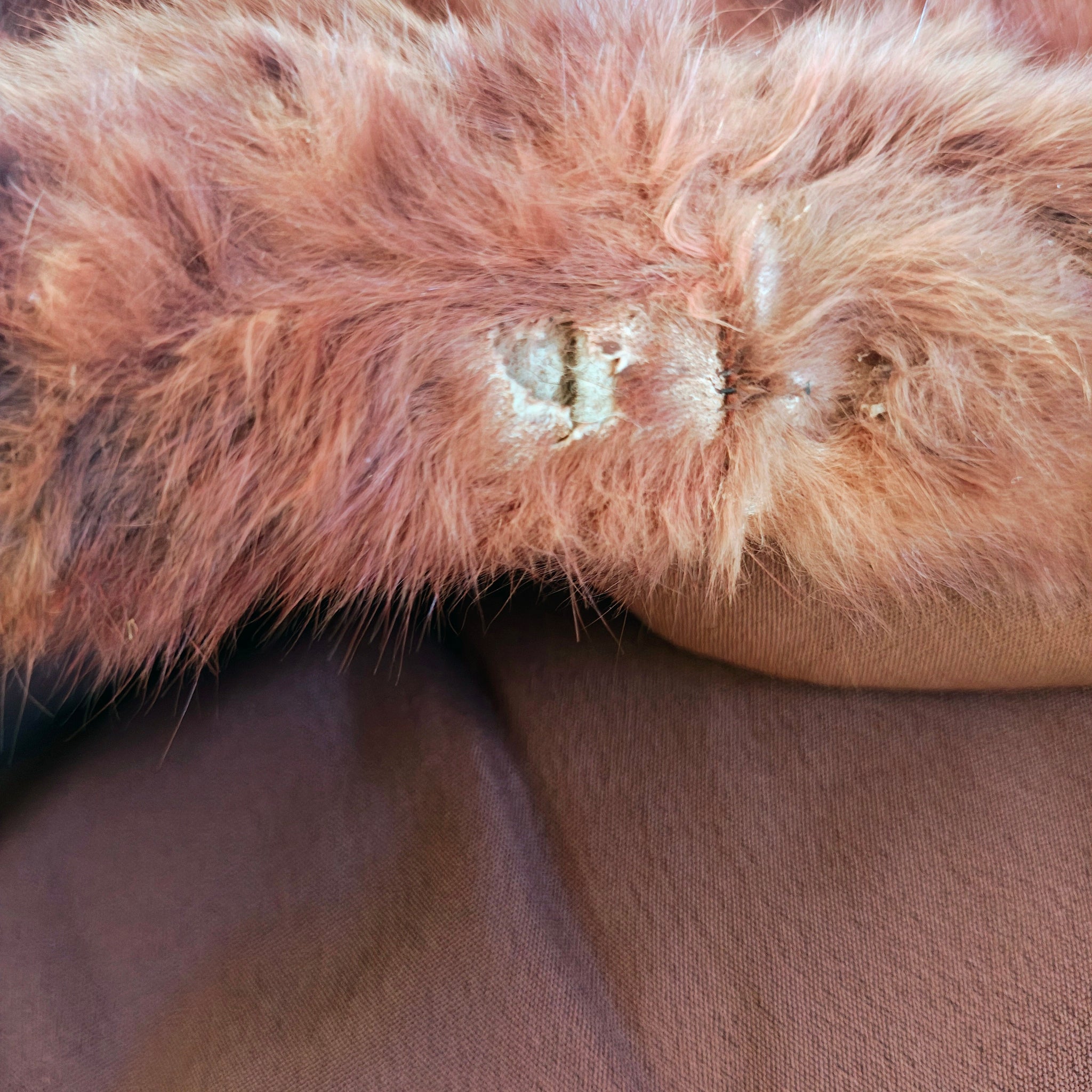 Overall in good condition for it's age. Lining has one area with small moth hole, closure is in tact and functional. Thefur still feels soft and secure and has beautiful shine. There are a few thin spots with balding on the bottom hem, shown in the photos. The interior collar also shows wear and deterioration, which can be easily mended to make them less visible.