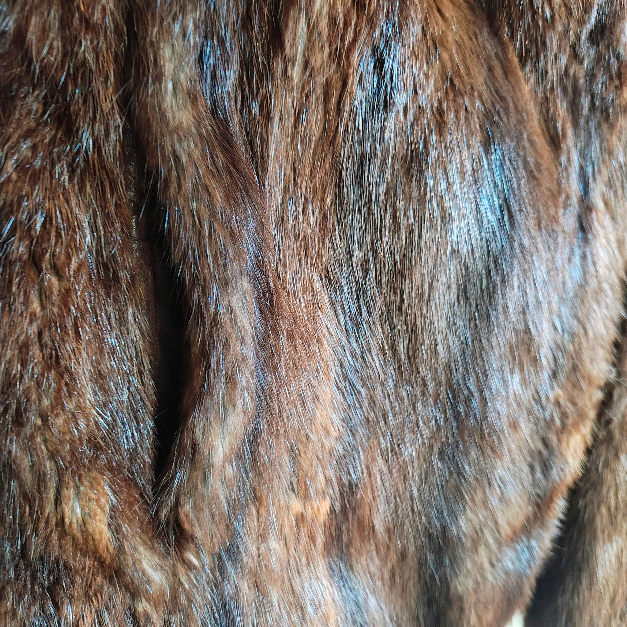 Very good vintage condition but not flawless. There are two small years on the interior lining. The fur is soft and supple with no shedding and all seams checked appear to be tight. There is small thin spot on the shoulder by the collar which is not very visible. Please review photos.