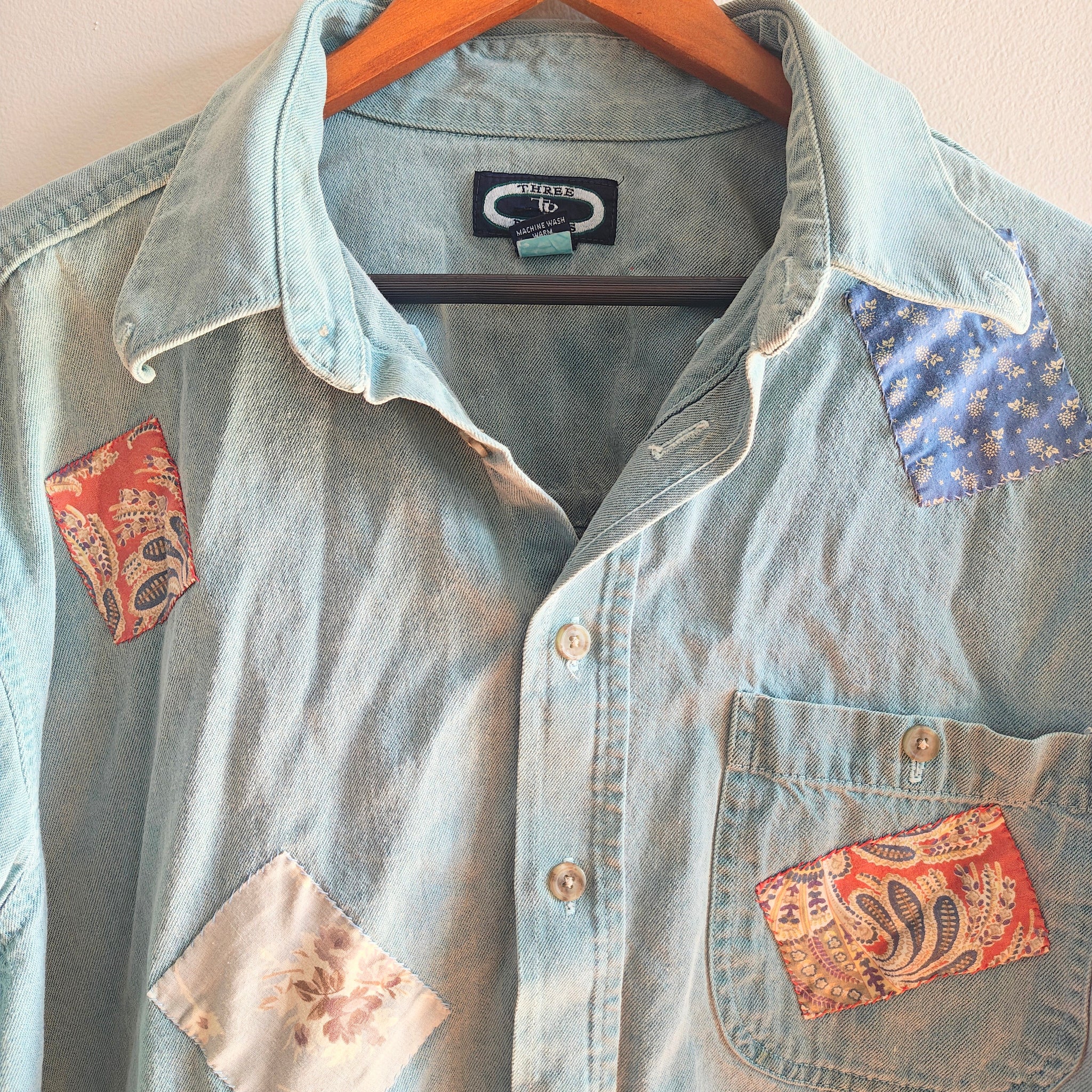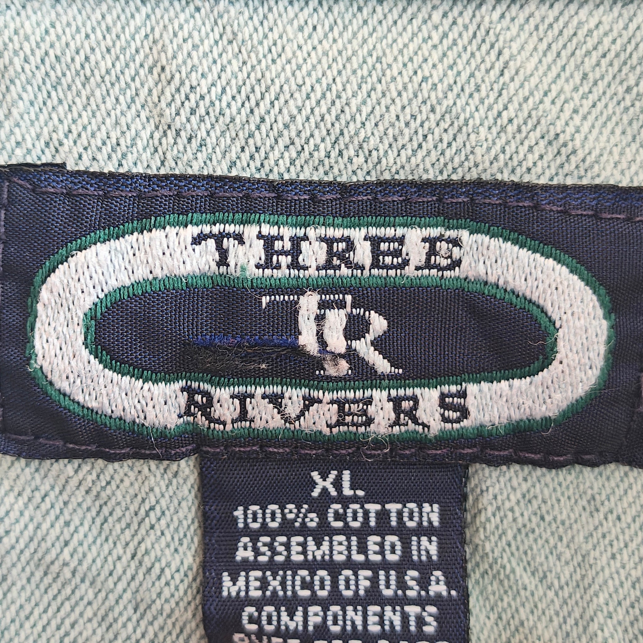 Three Rivers brand vintage denim shirt. The Three Rivers brand is known for producing denim shirts, often featuring unique designs like the patchwork visible on this item.