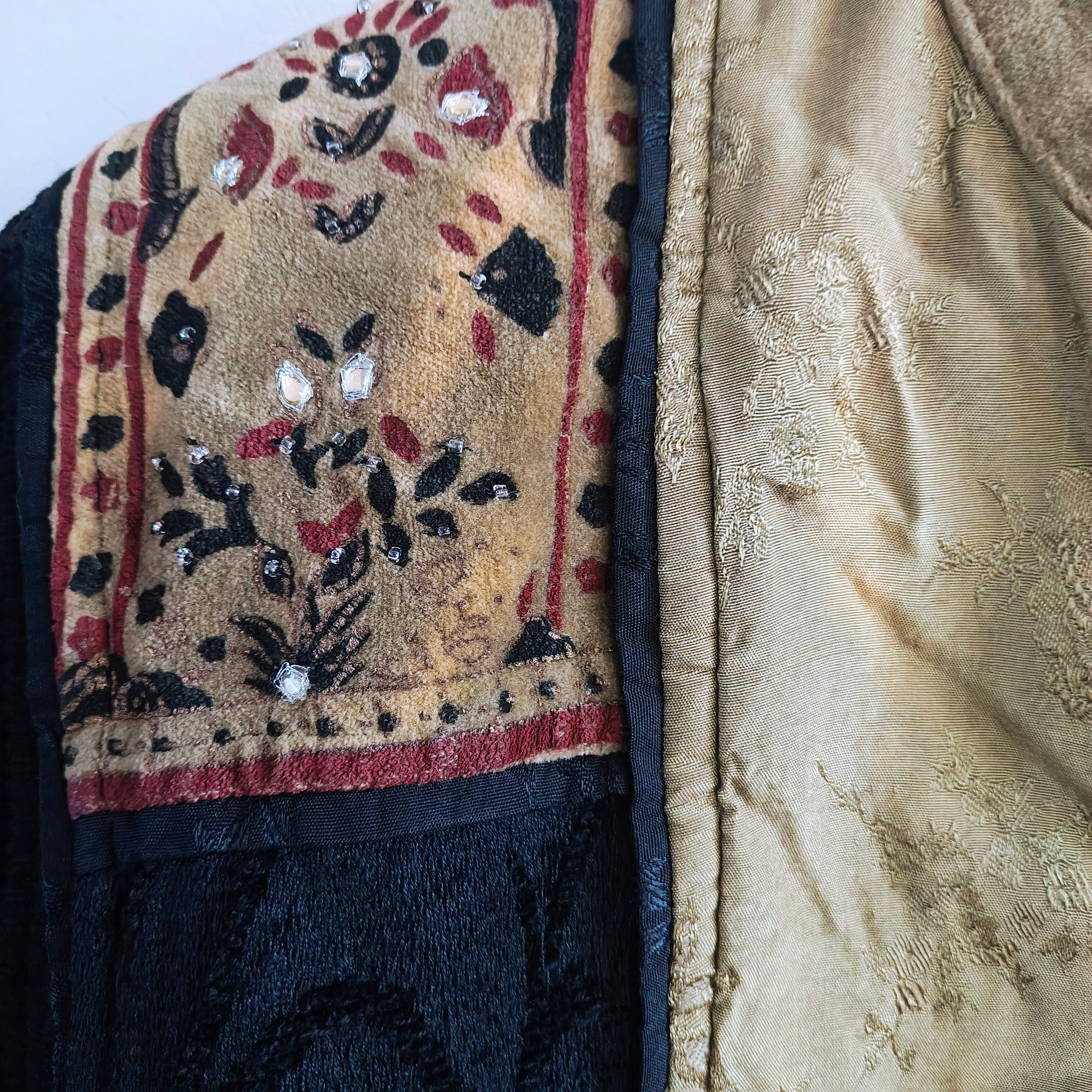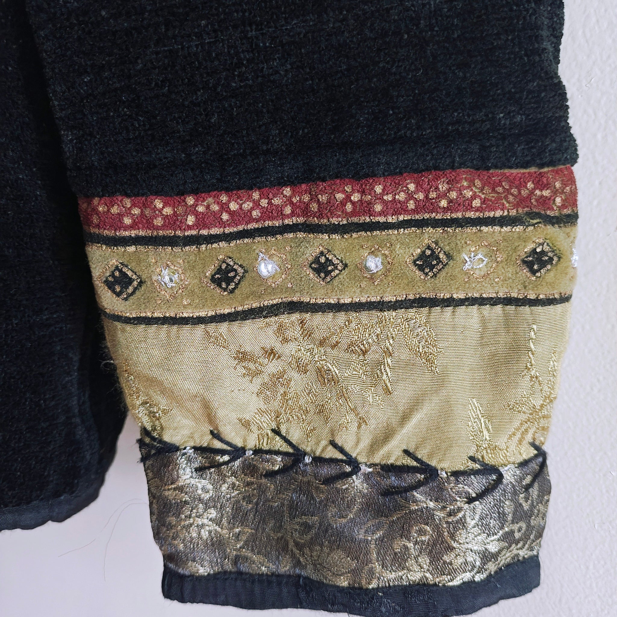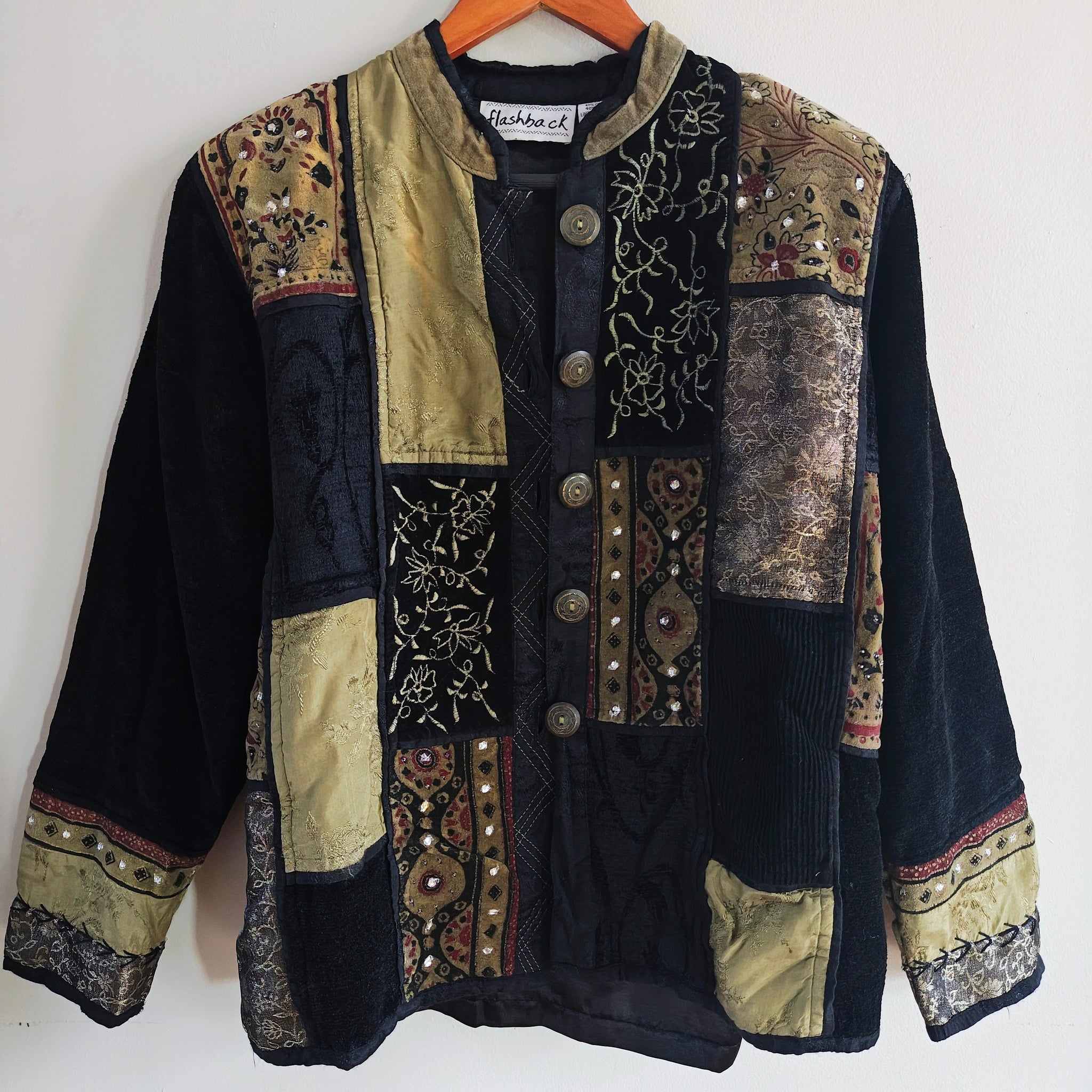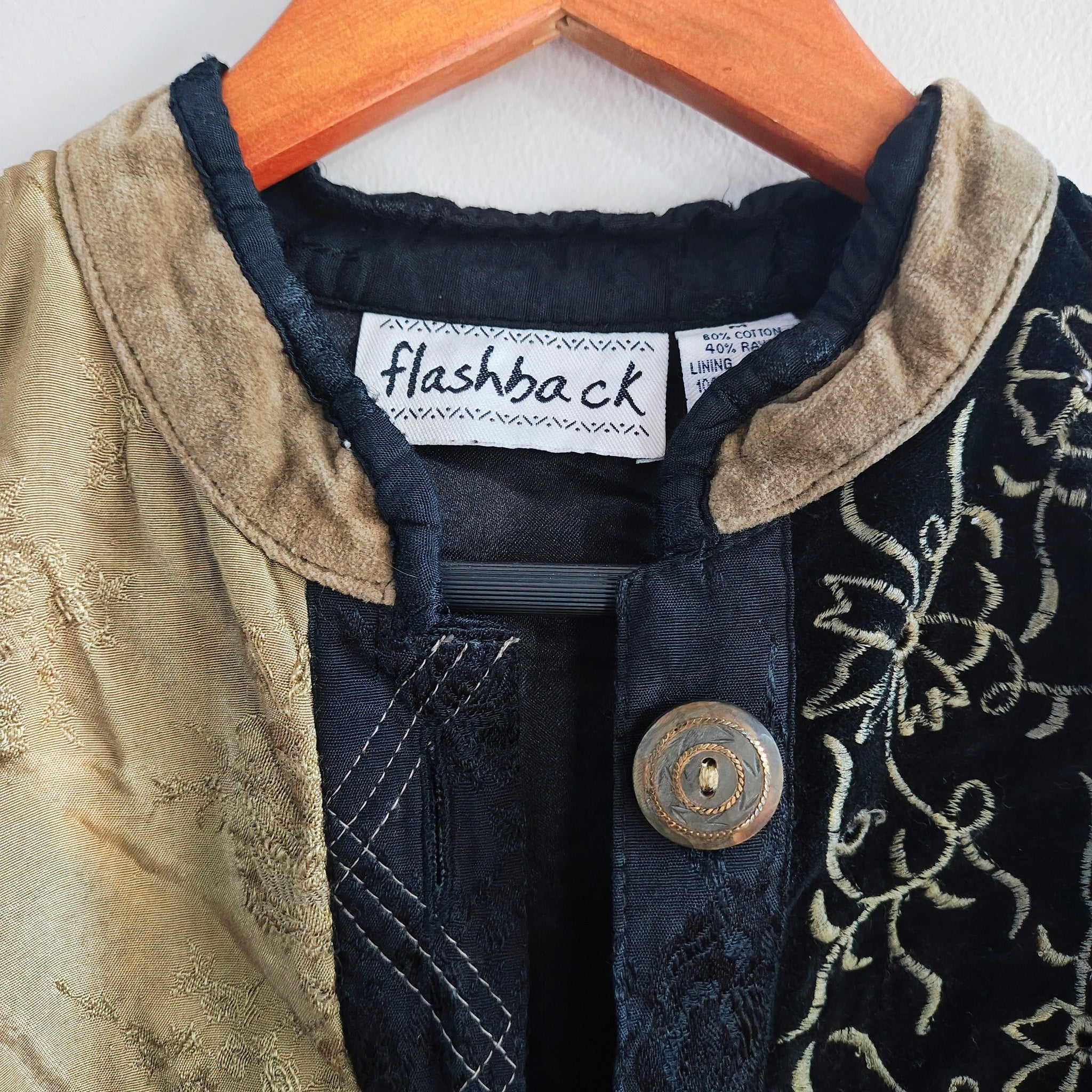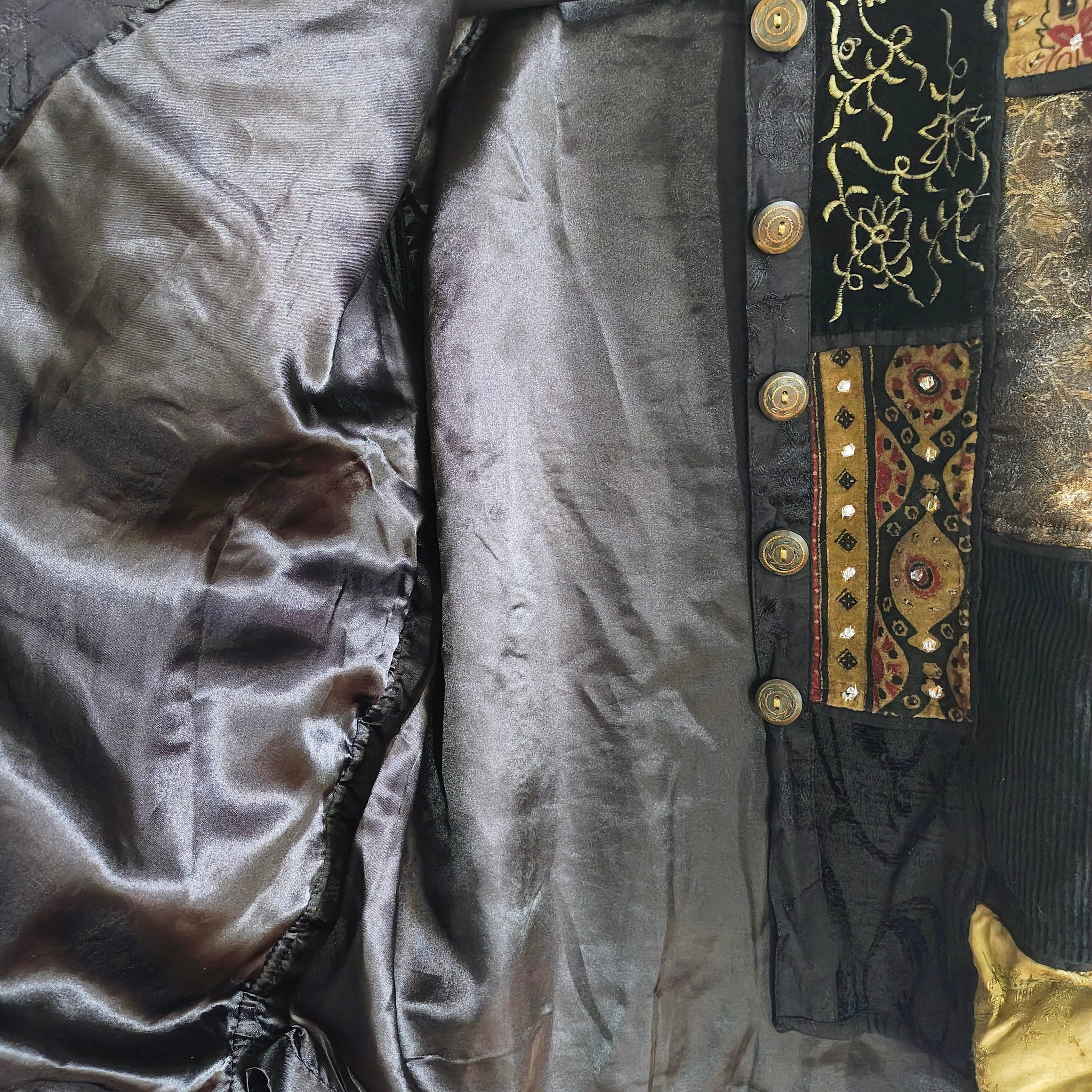Vintage Flashback brand patchwork jacket. These bohemian, "art-to-wear" jackets from the 80s are known for their mixed media designs featuring various textures and fabrics such as velvet, tapestry, corduroy and brocade with chenille-like body and satin lining.