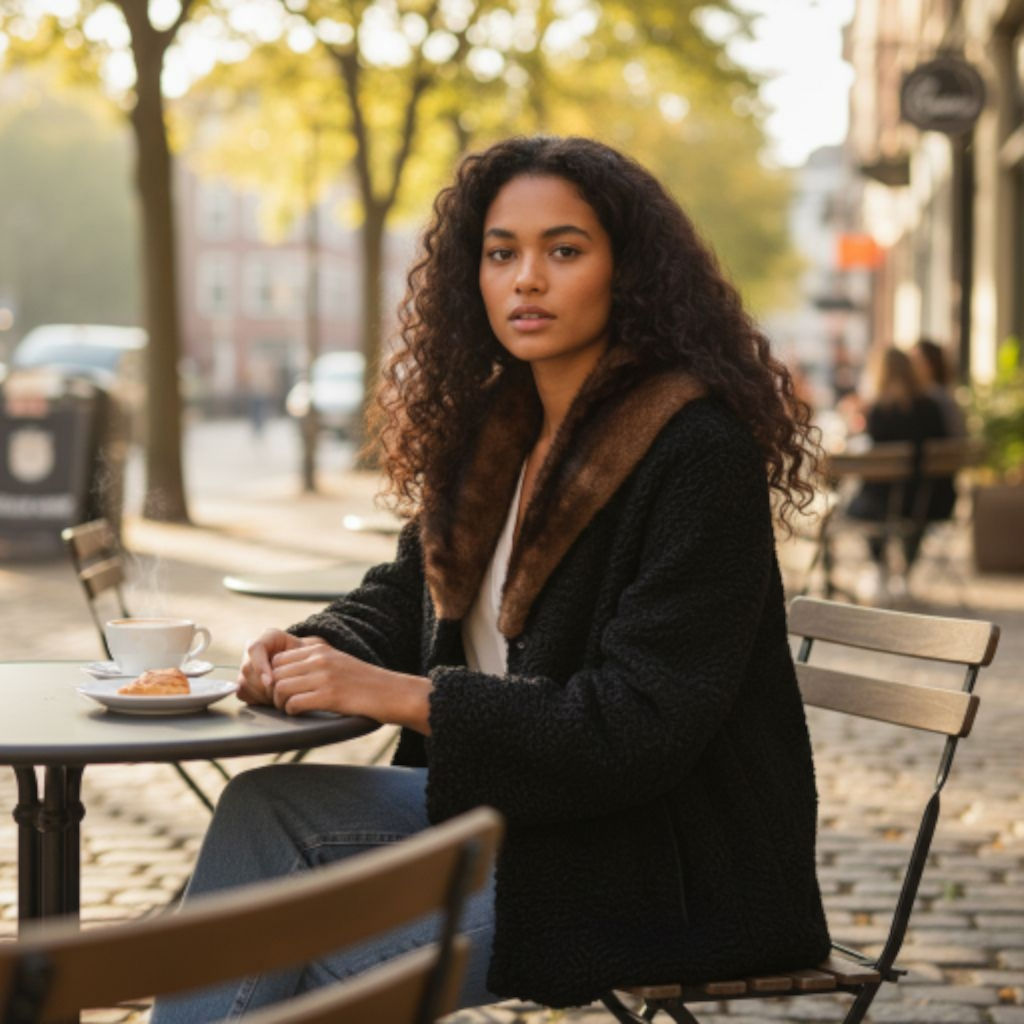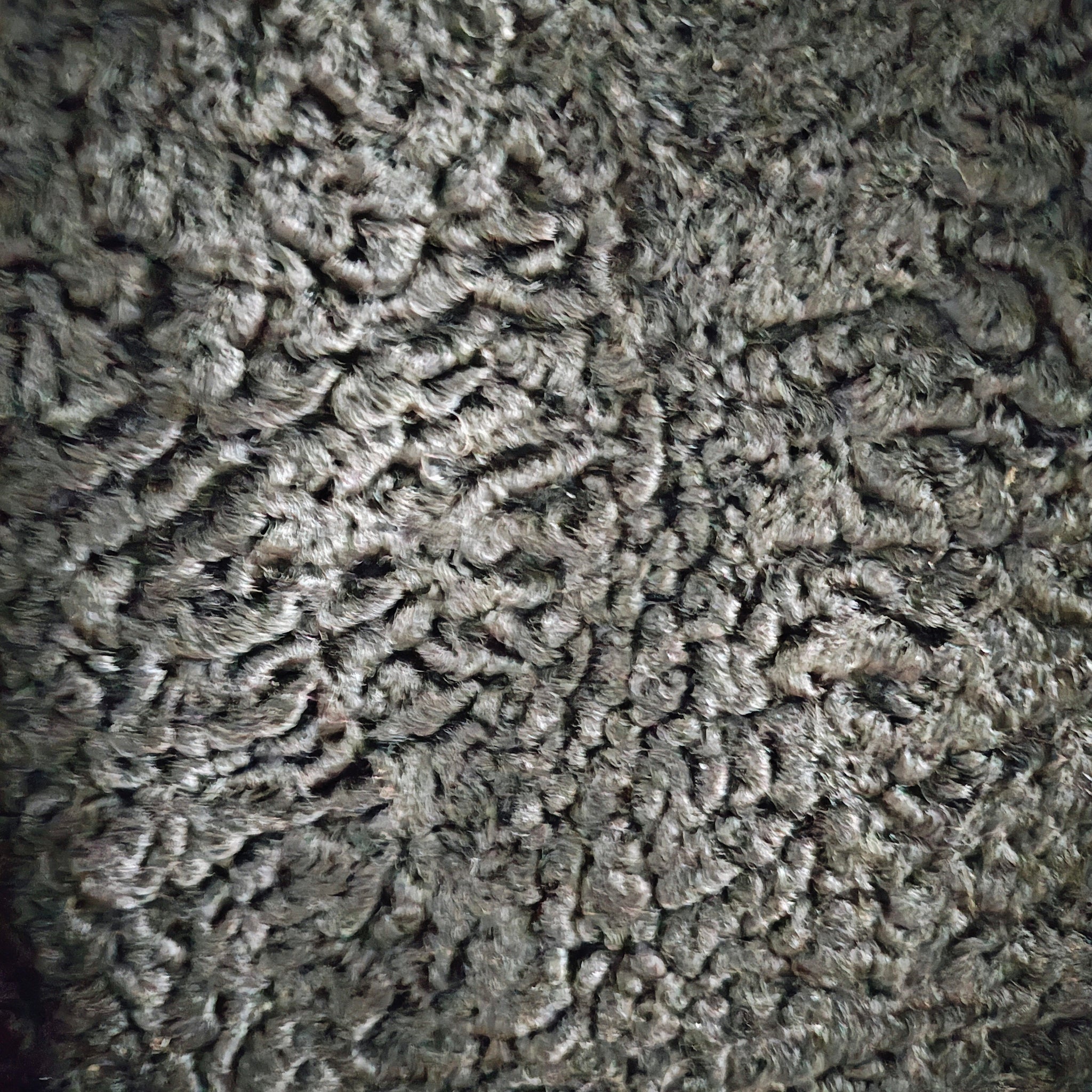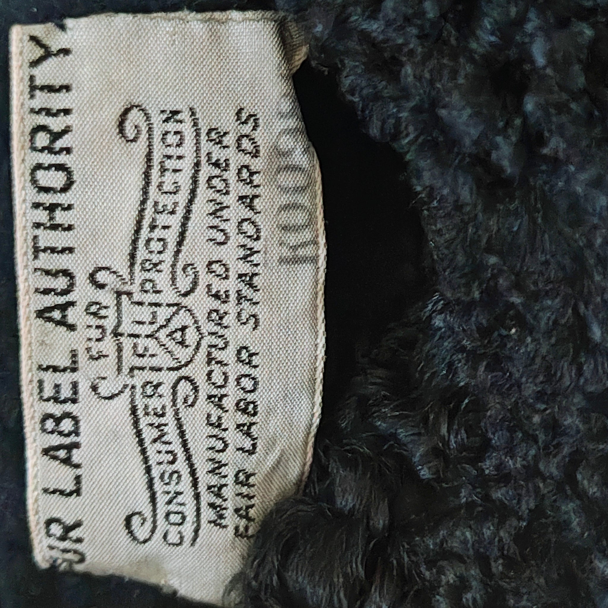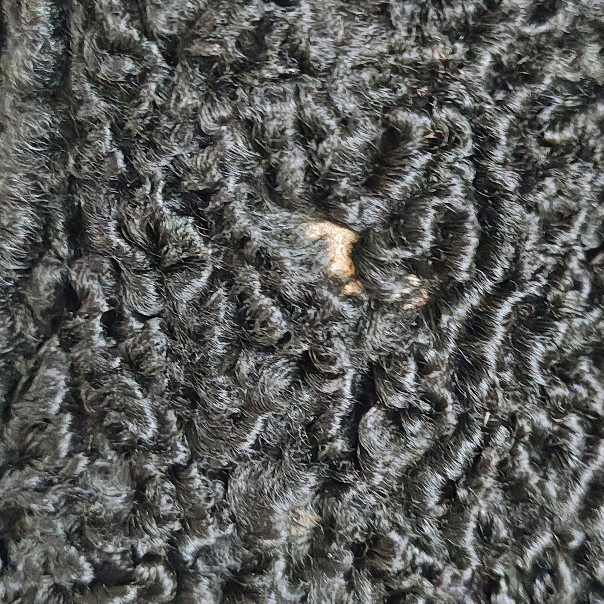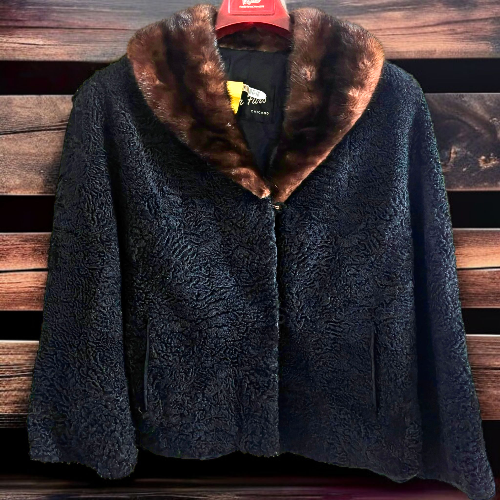 Material: The body of the coat is made from black curly lamb wool, known by various names such as Persian lamb, Astrakhan, Karakul, or Swakara. This material is known for its tightly looped, rippled texture and durability.