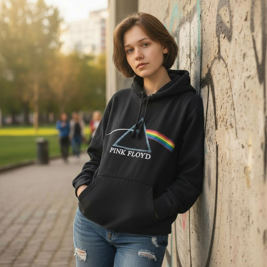 Pink Floyd "Dark Side of the Moon" graphic pullover hoodie. It features the iconic album cover art, the prism refracting light into a rainbow, along with the band's name printed beneath.