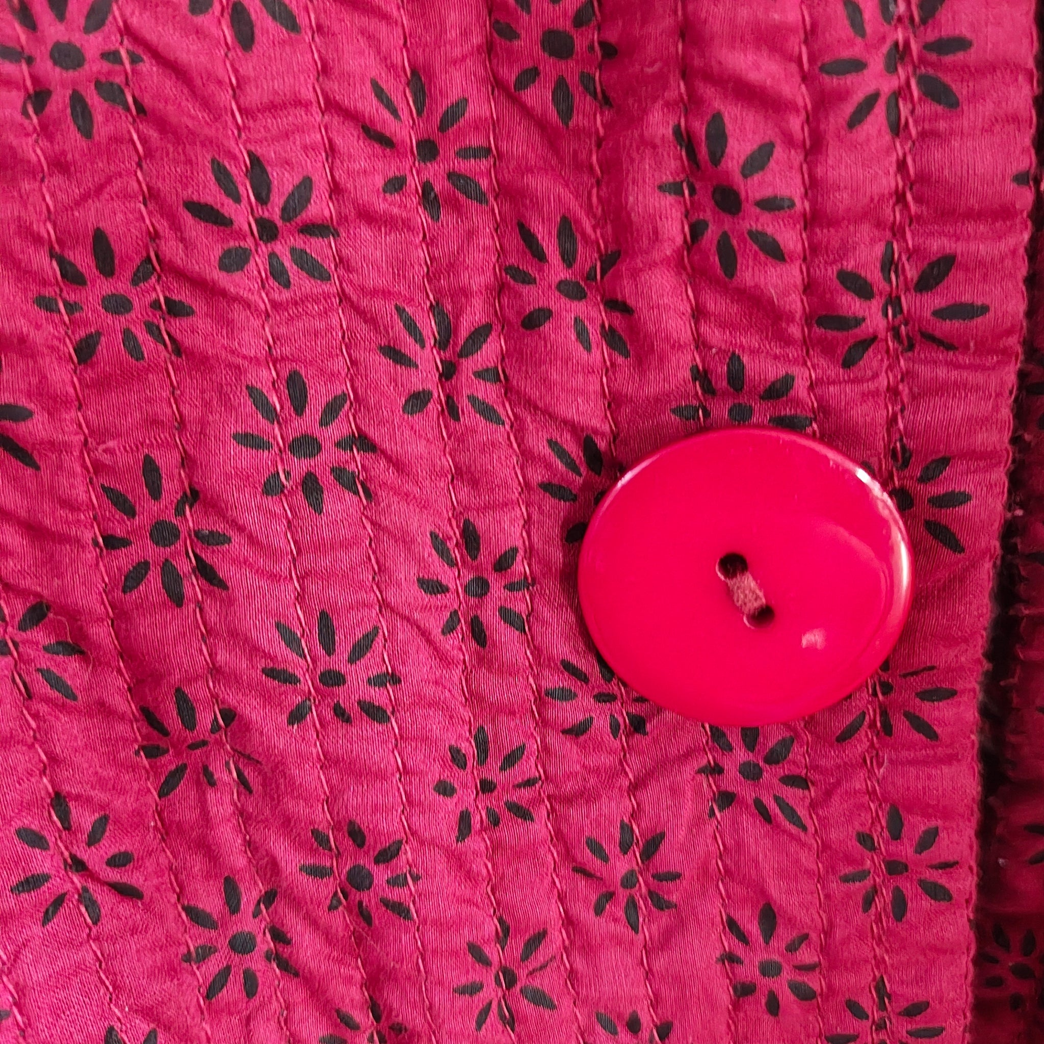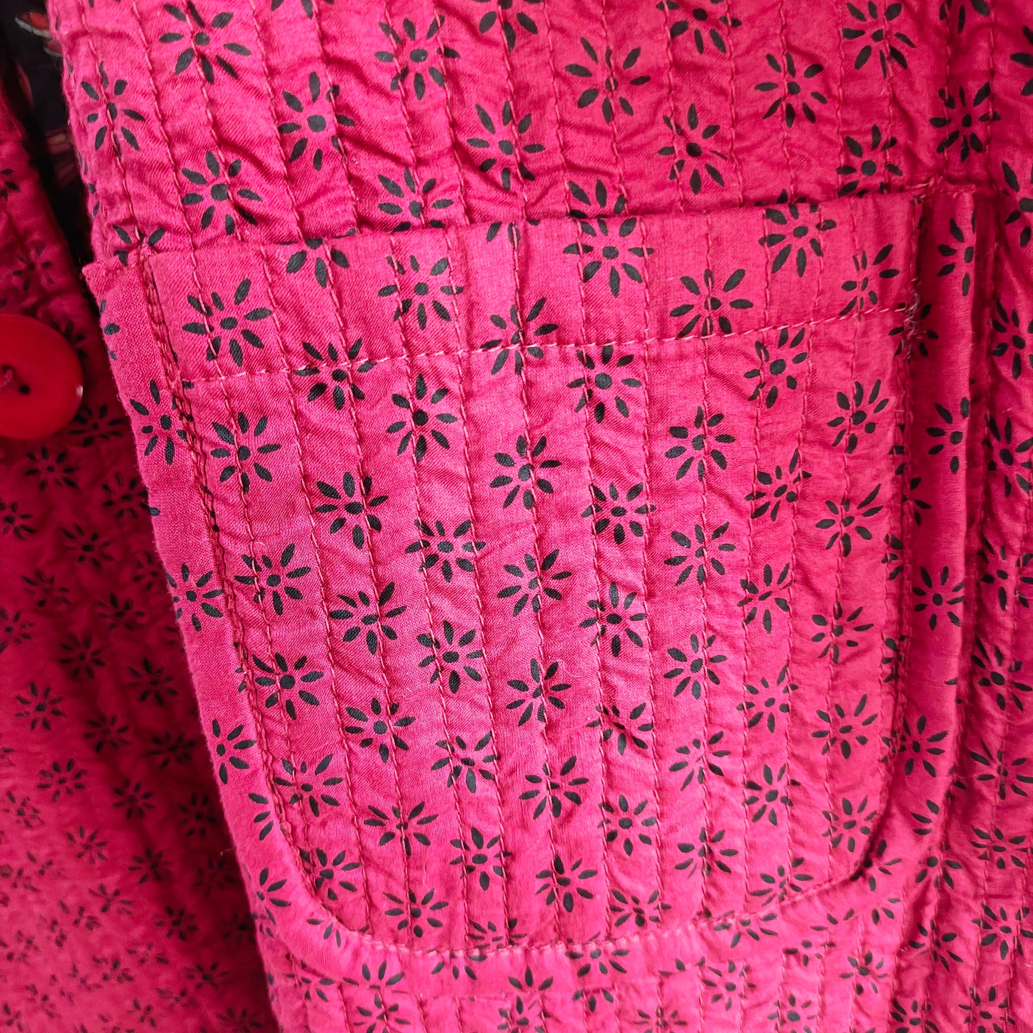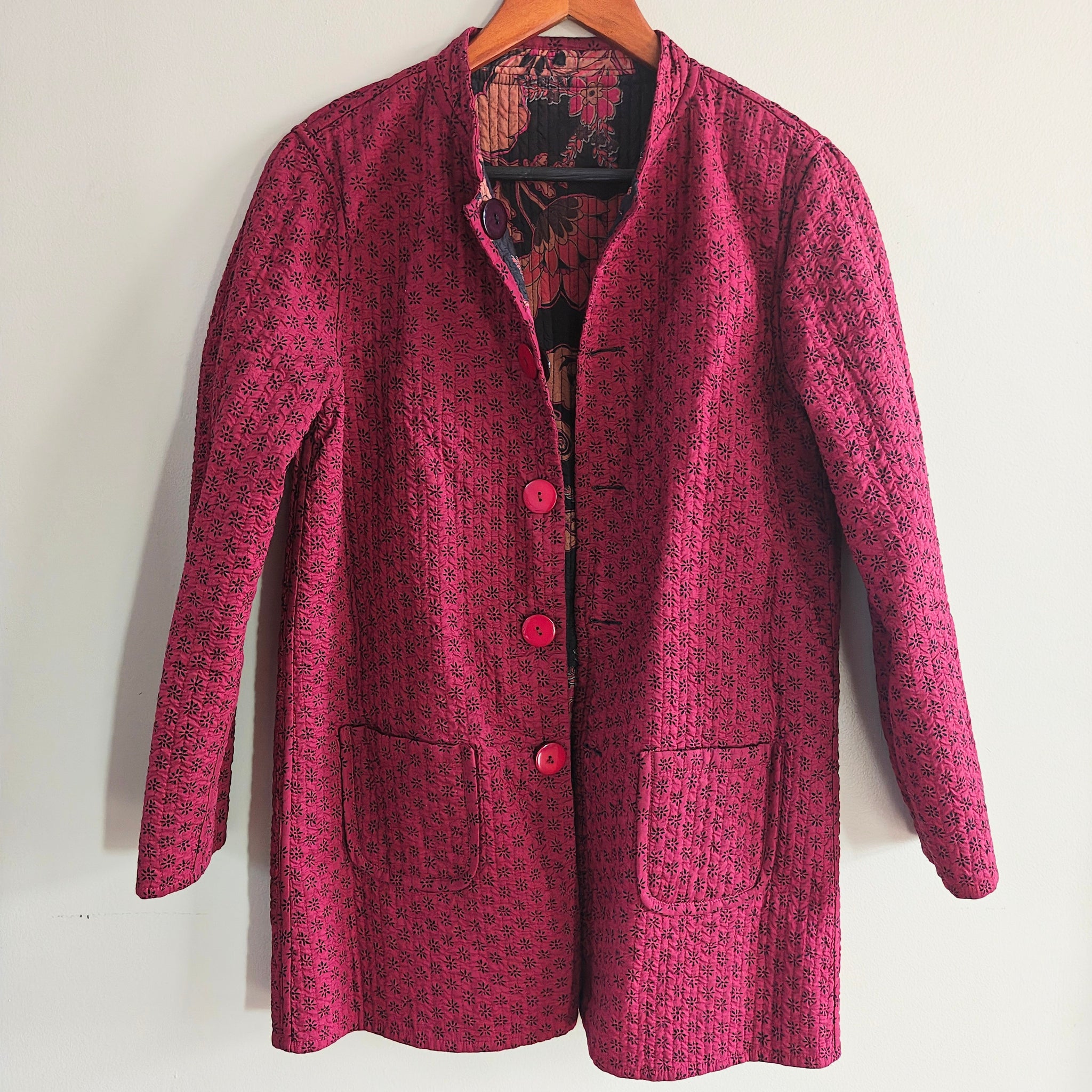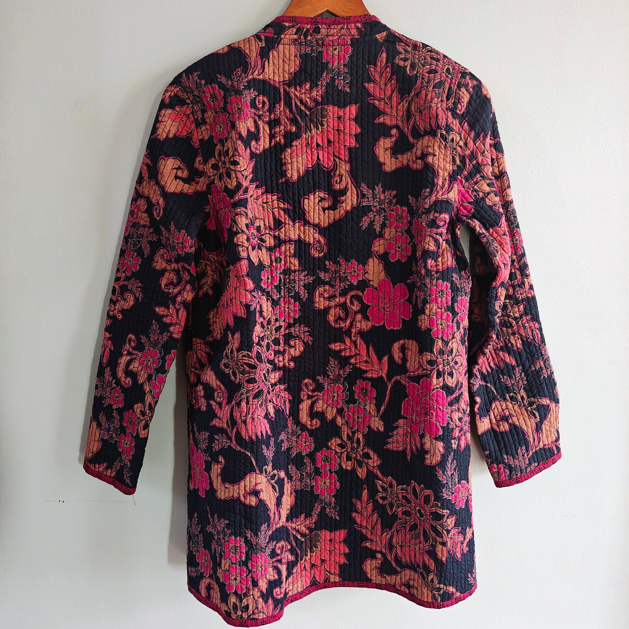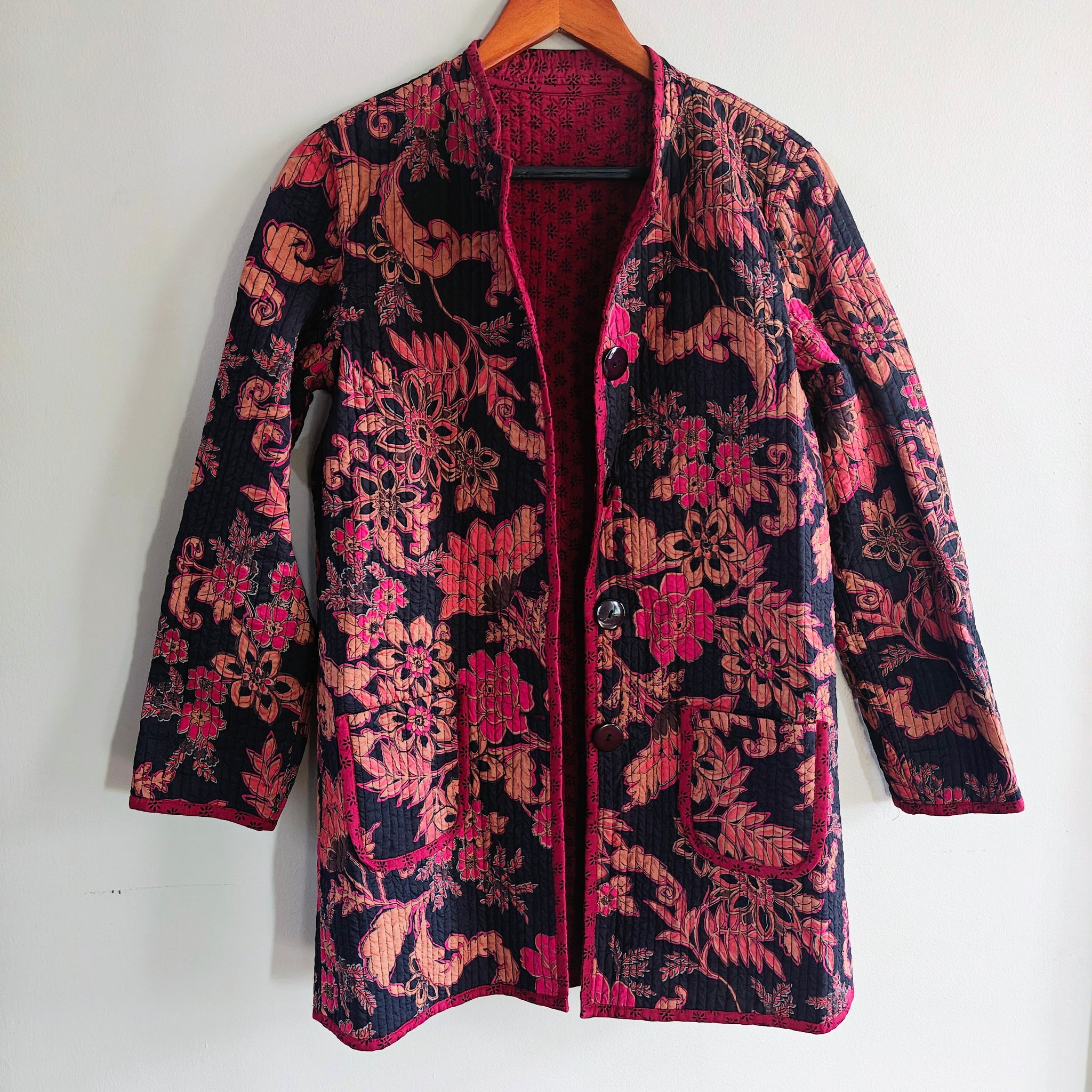 Reversible, quilted floral jacket. These jackets are often handmade, in India, using the traditional Kantha stitching method on multiple layers of fabric, which gives them a distinct texture and makes them lightweight yet warm.