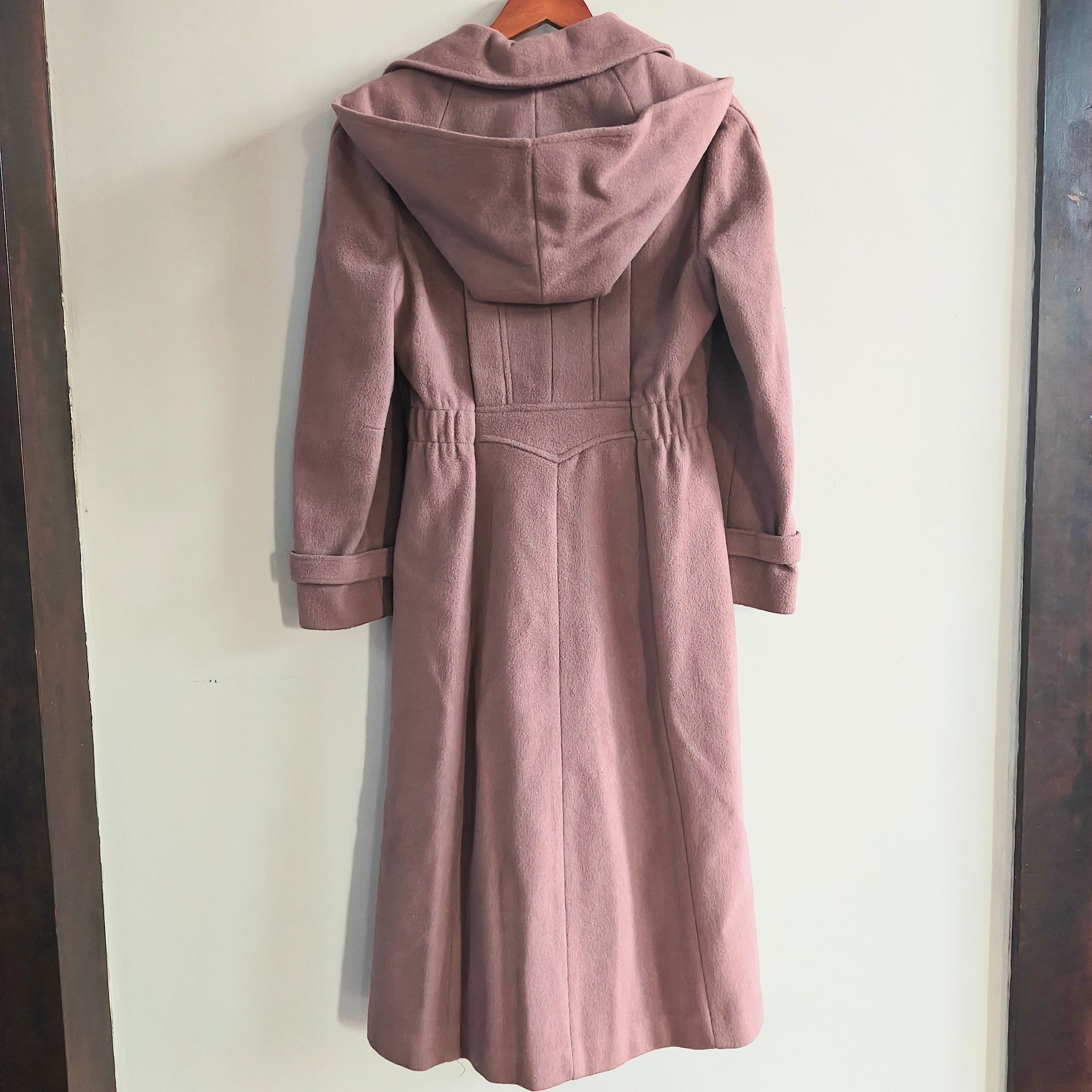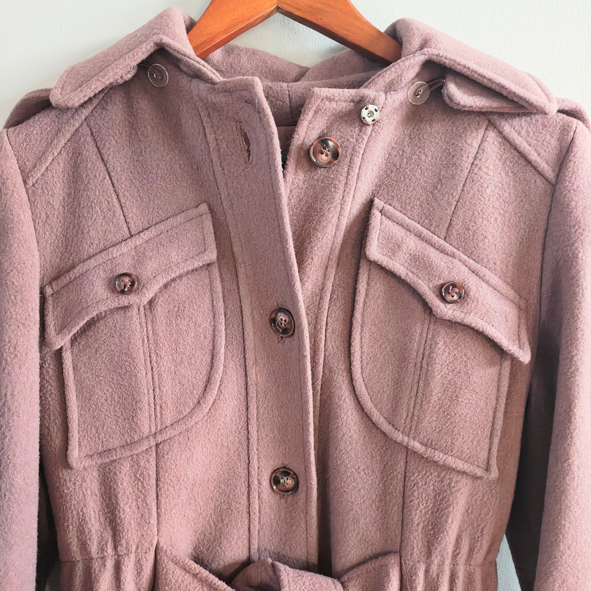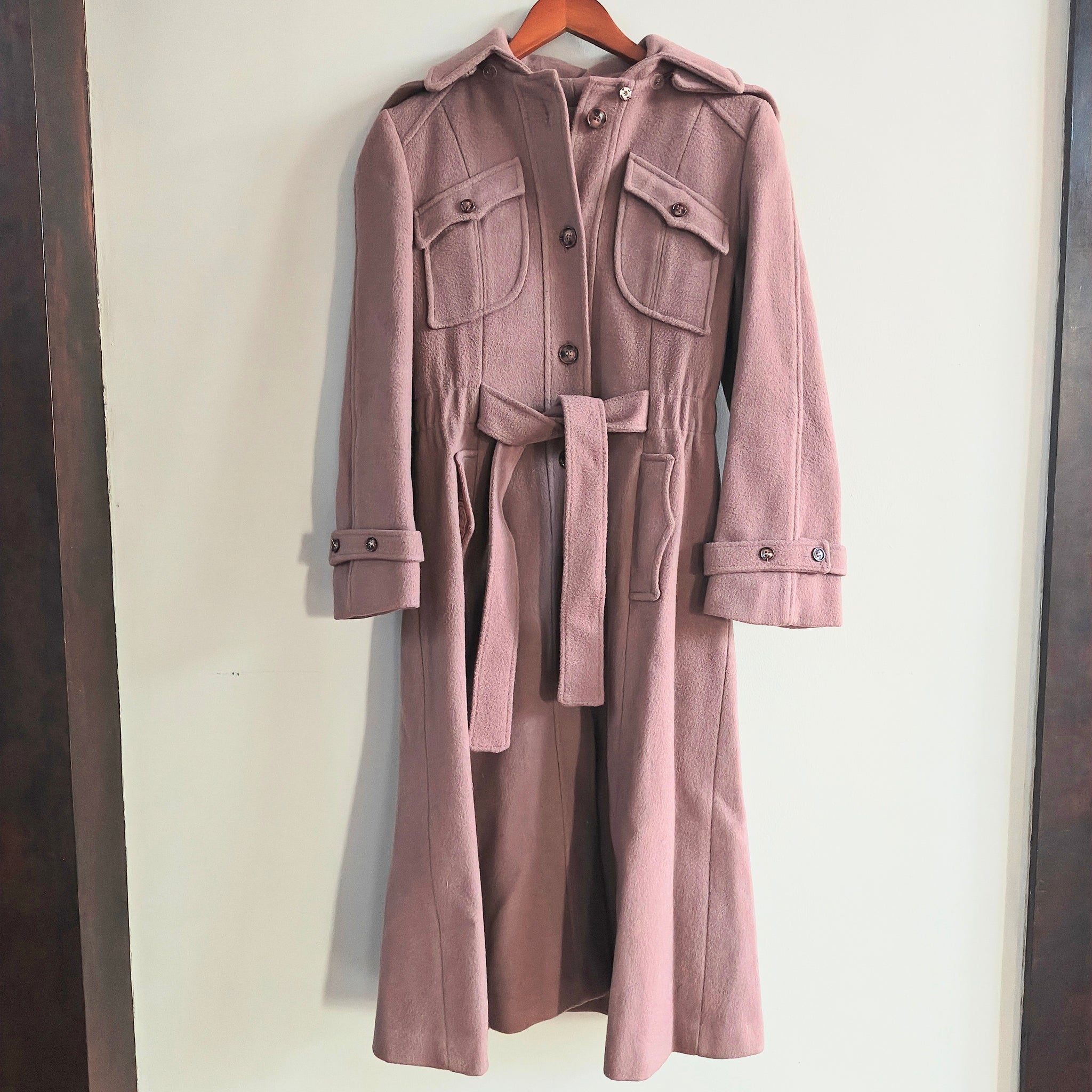 Vintage, long, belted wool coat with detachable hood. It features a mauve or dusty pink color, shoulder epaulets, and large flap pockets on the chest, which are characteristic details of military-inspired or safari-style coats, especially those from the 1960s or 1970s.