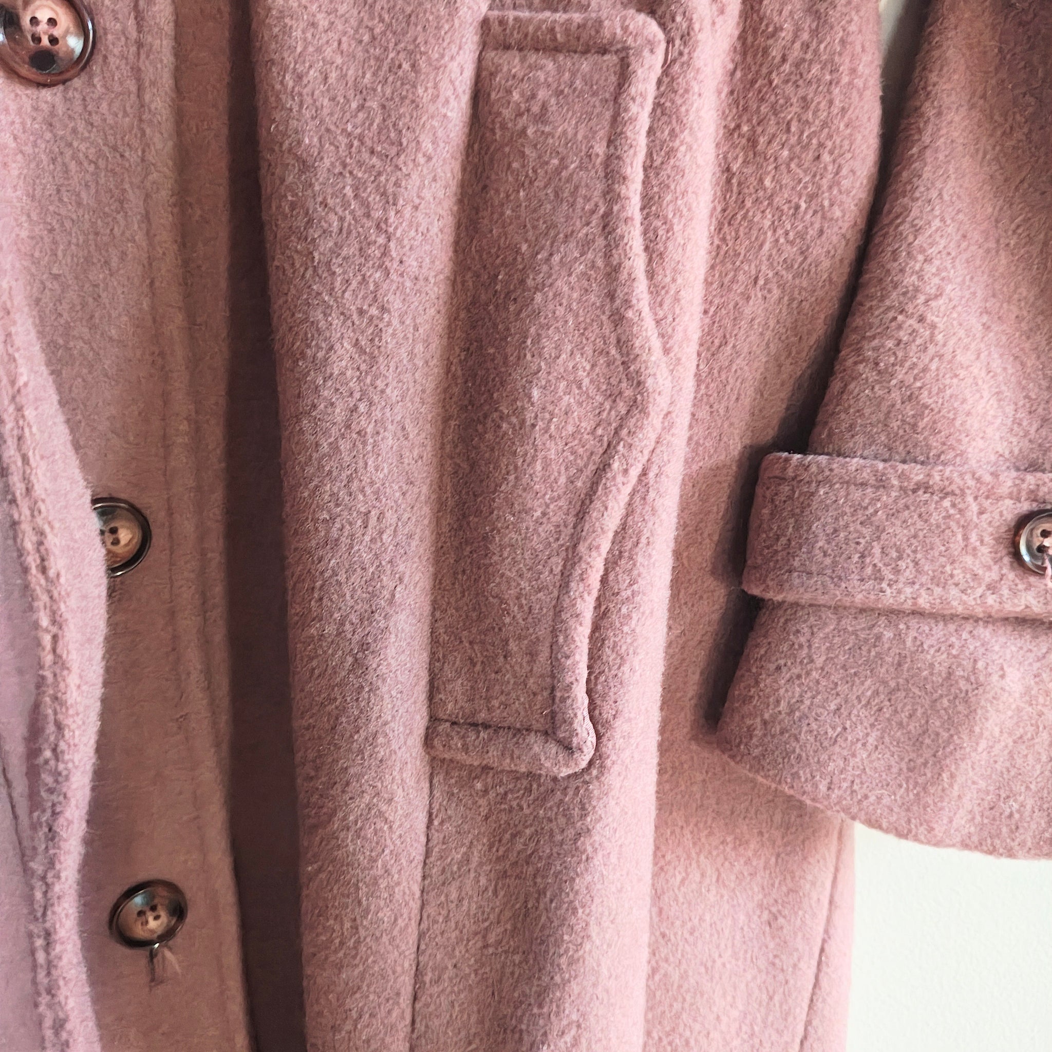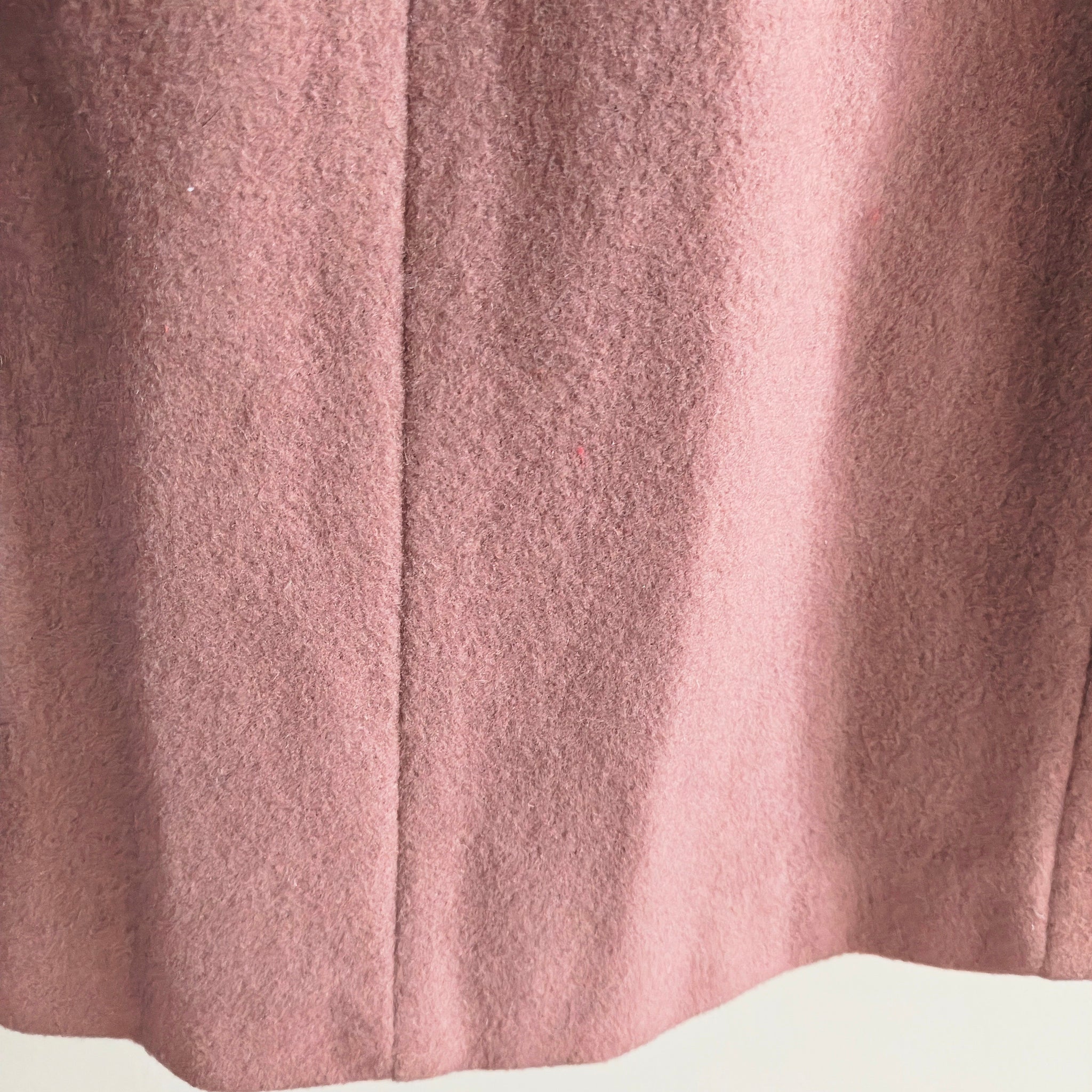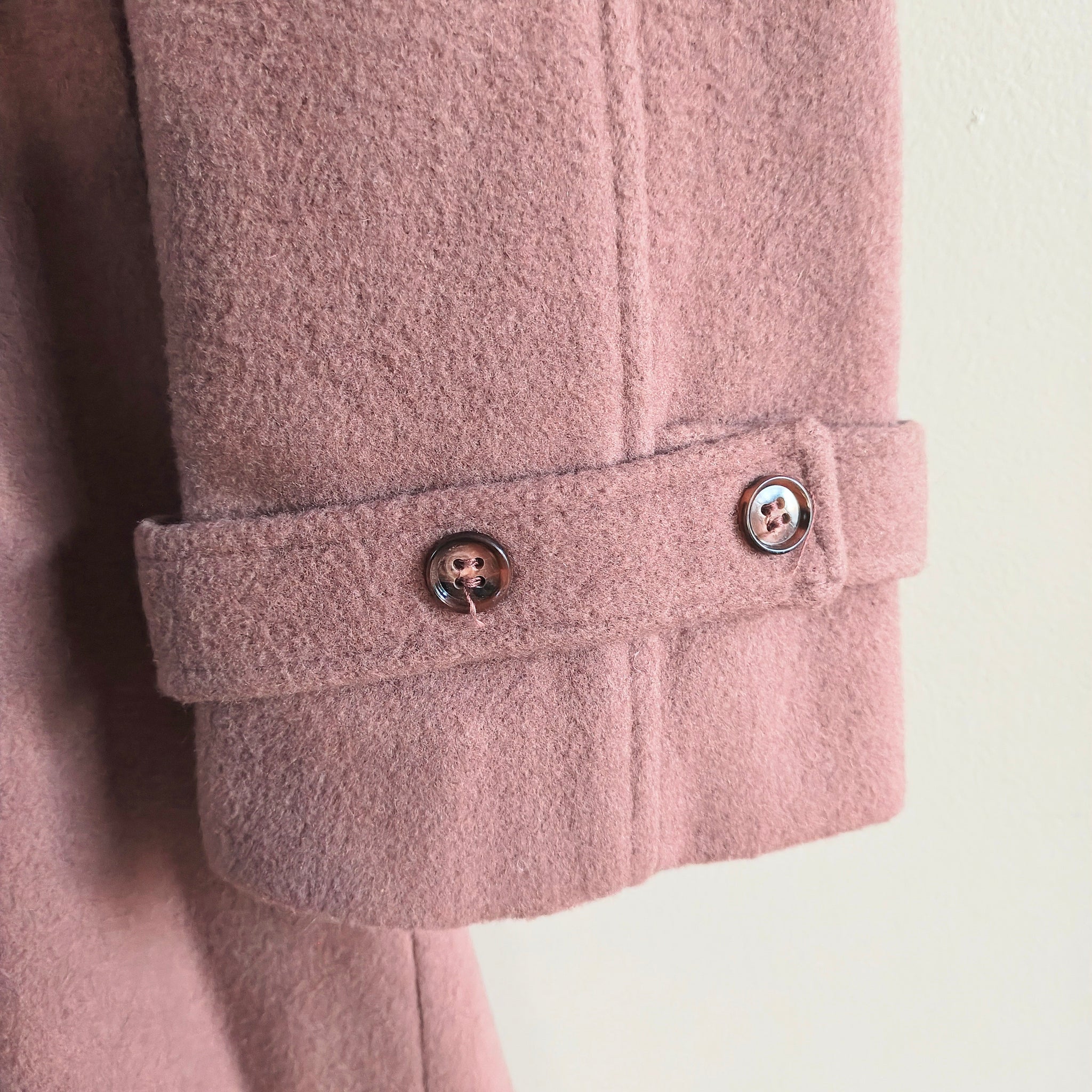 Vintage, long, belted wool coat with detachable hood. It features a mauve or dusty pink color, shoulder epaulets, and large flap pockets on the chest, which are characteristic details of military-inspired or safari-style coats, especially those from the 1960s or 1970s.