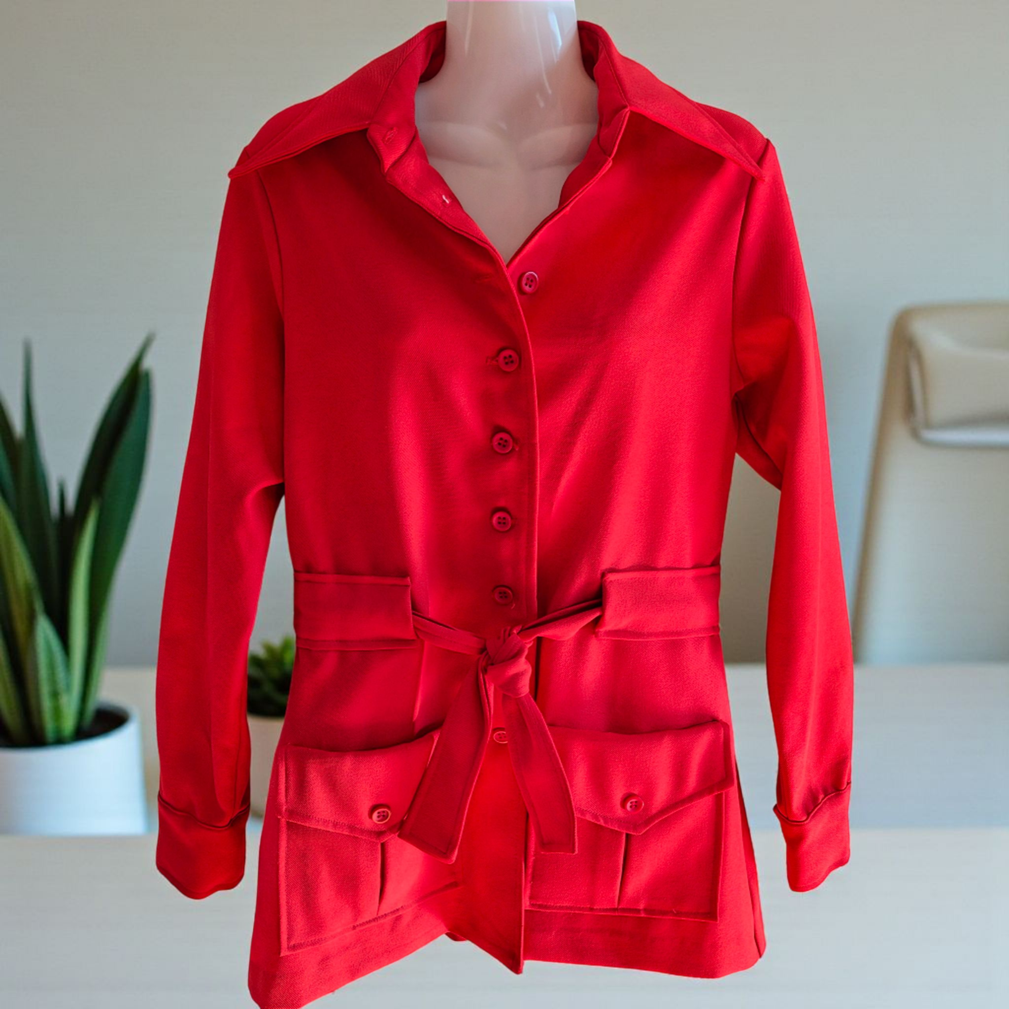 Style: The jacket has a structured, collared design with a matching tie belt to define the waist, giving it a slightly tailored A-line shape.
