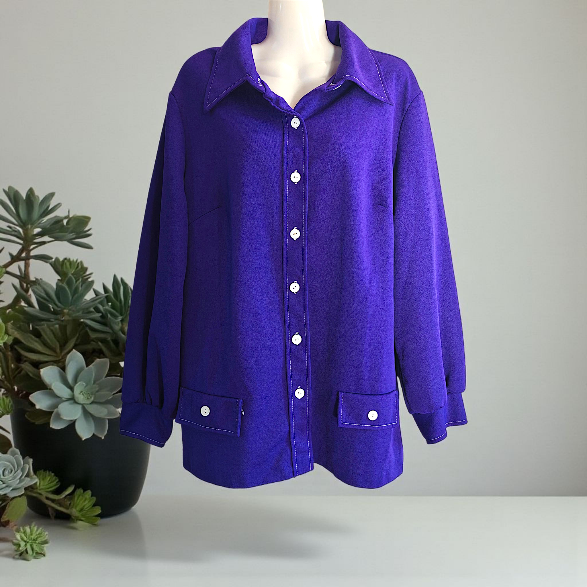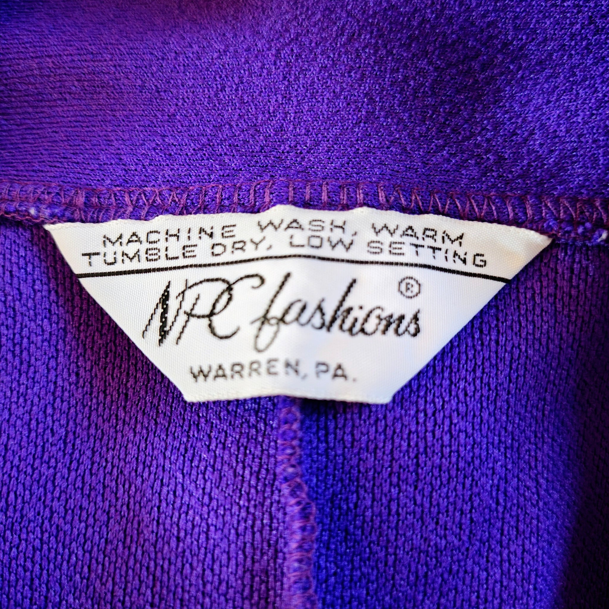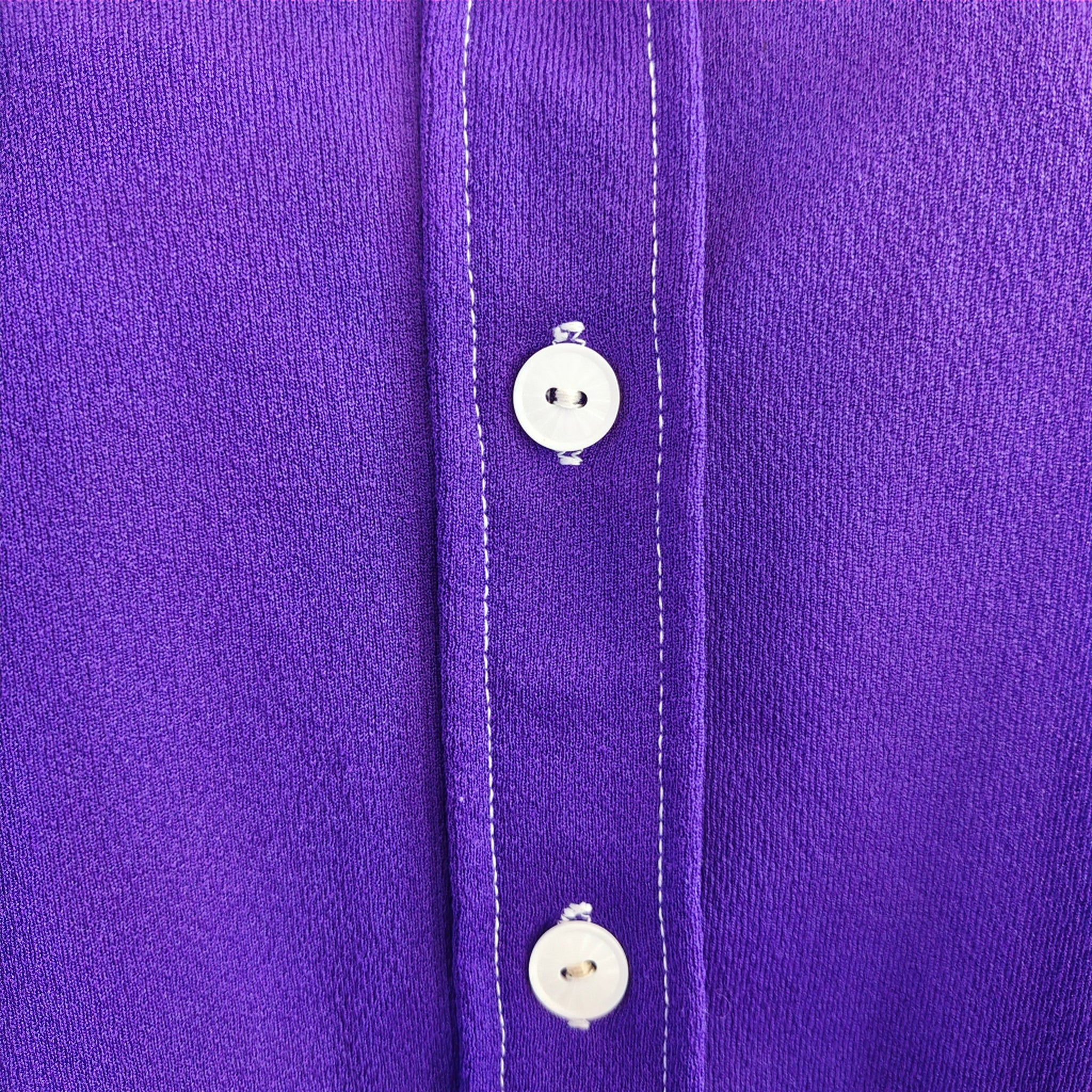 Vintage purple polyester knit shirt or light jacket. It features distinctive design elements such as white accent stitching, white buttons, a prominent collar, and two front patch pockets.