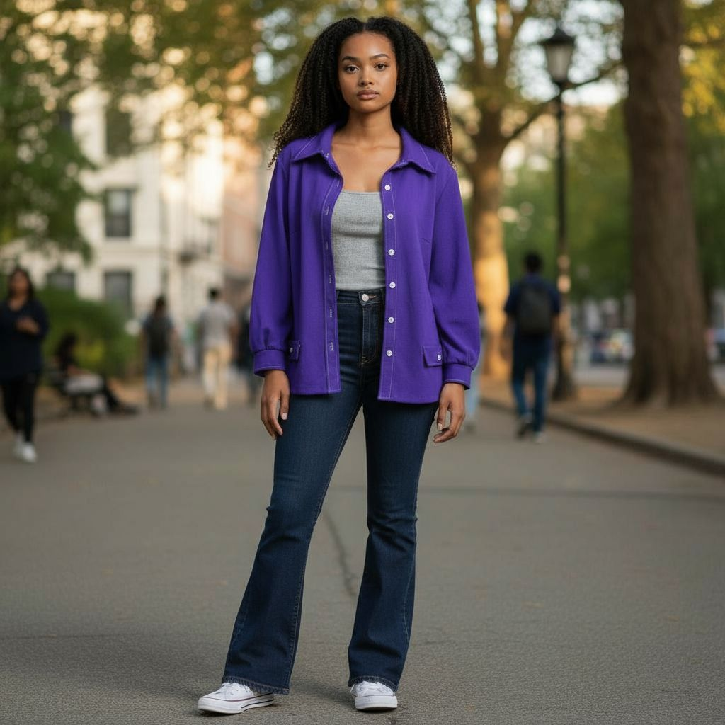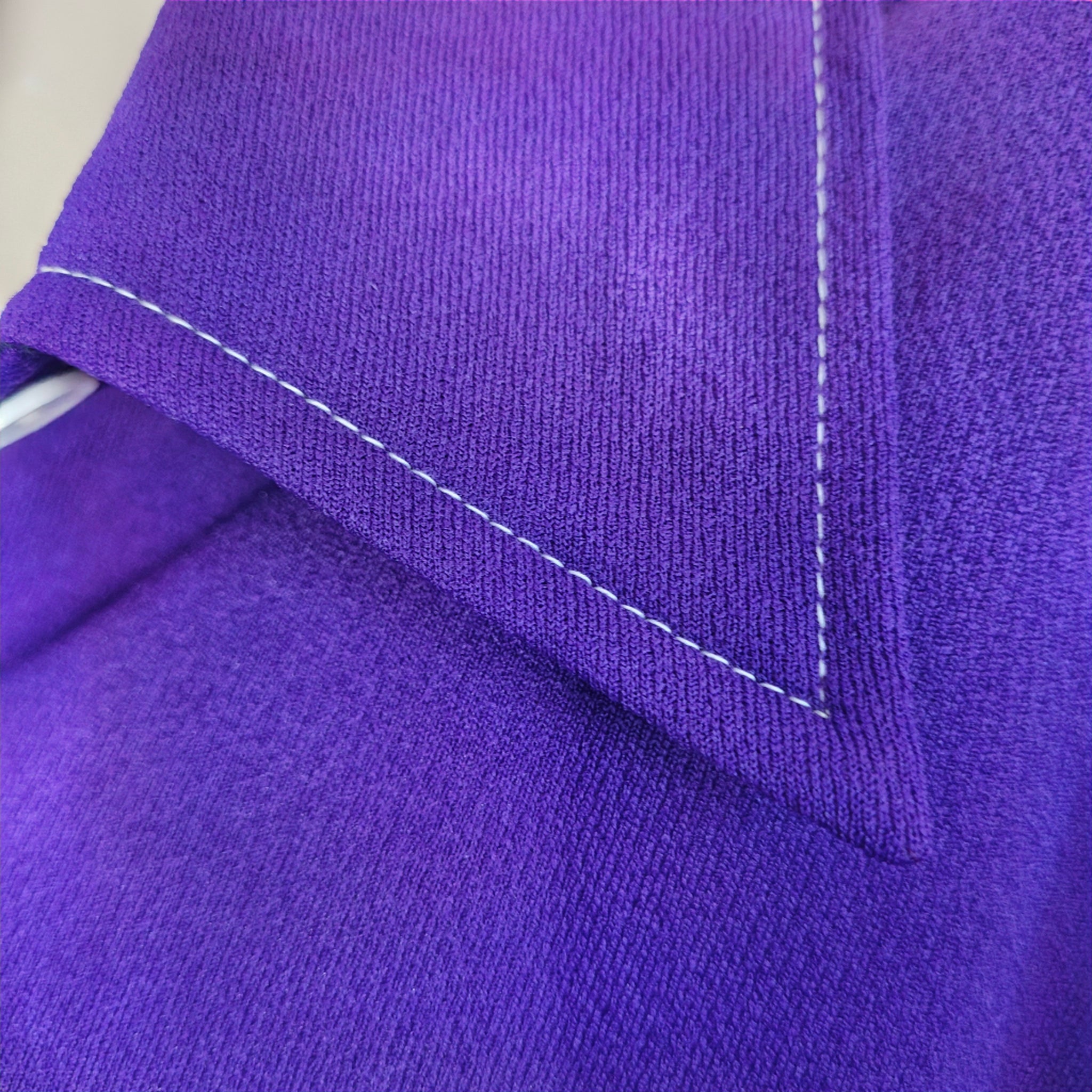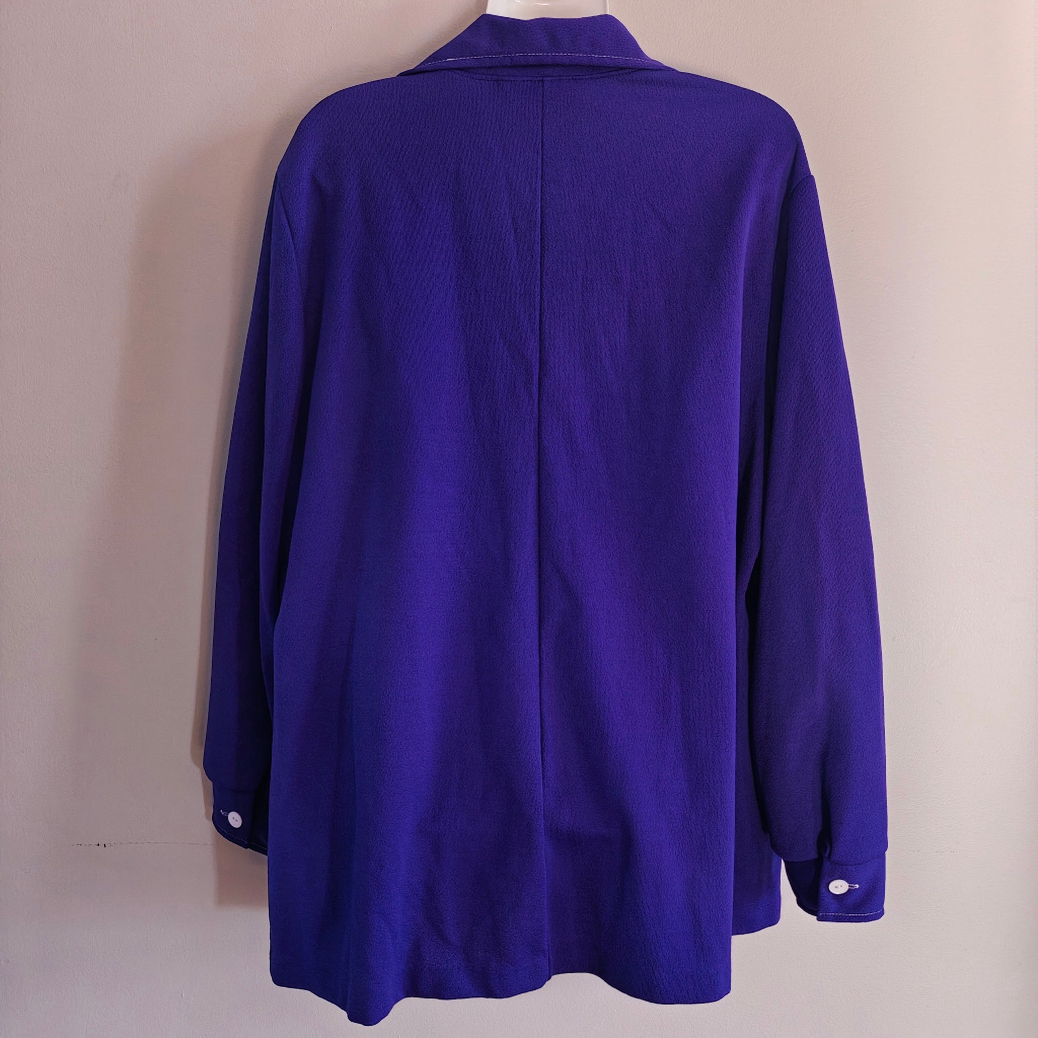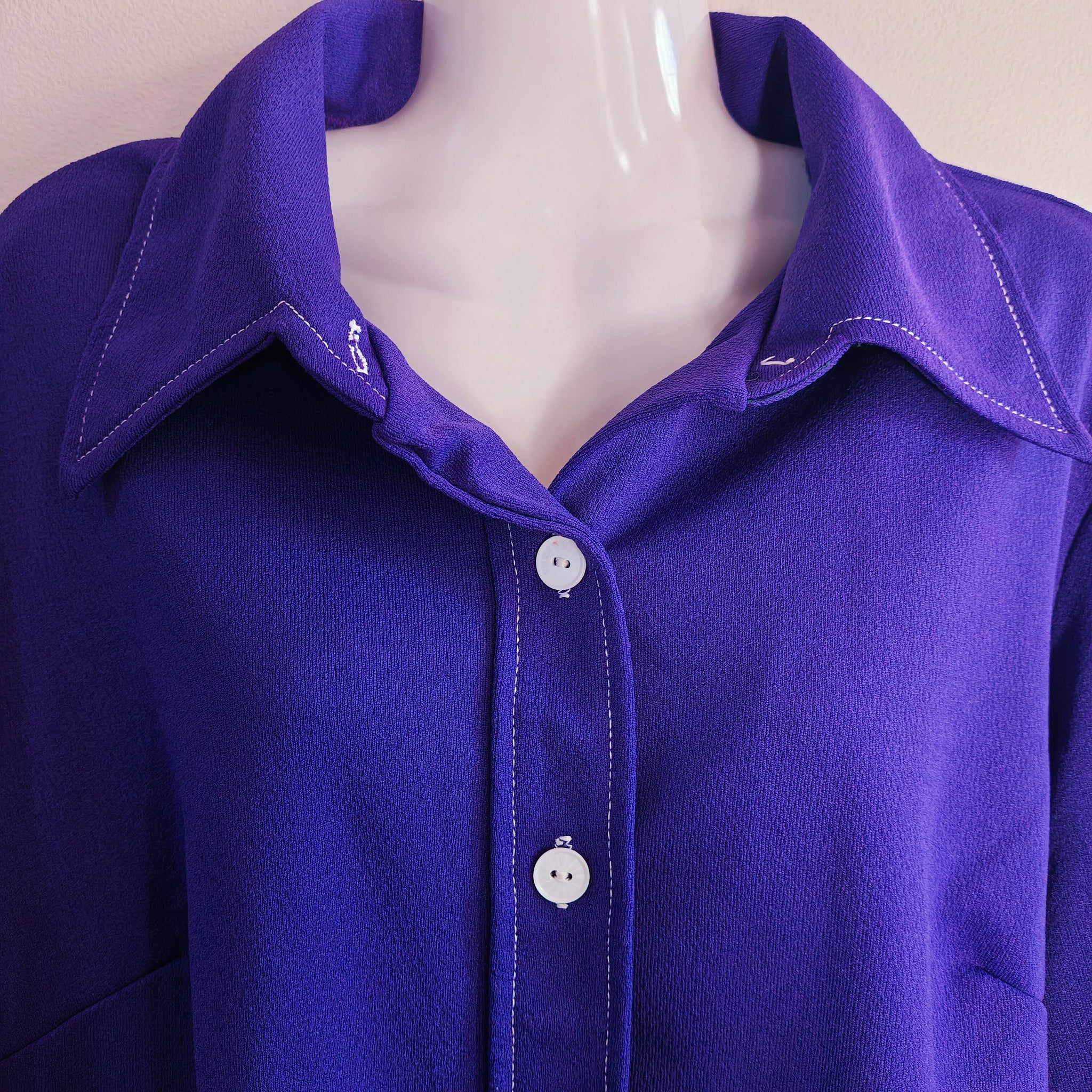 Vintage purple polyester knit shirt or light jacket. It features distinctive design elements such as white accent stitching, white buttons, a prominent collar, and two front patch pockets.