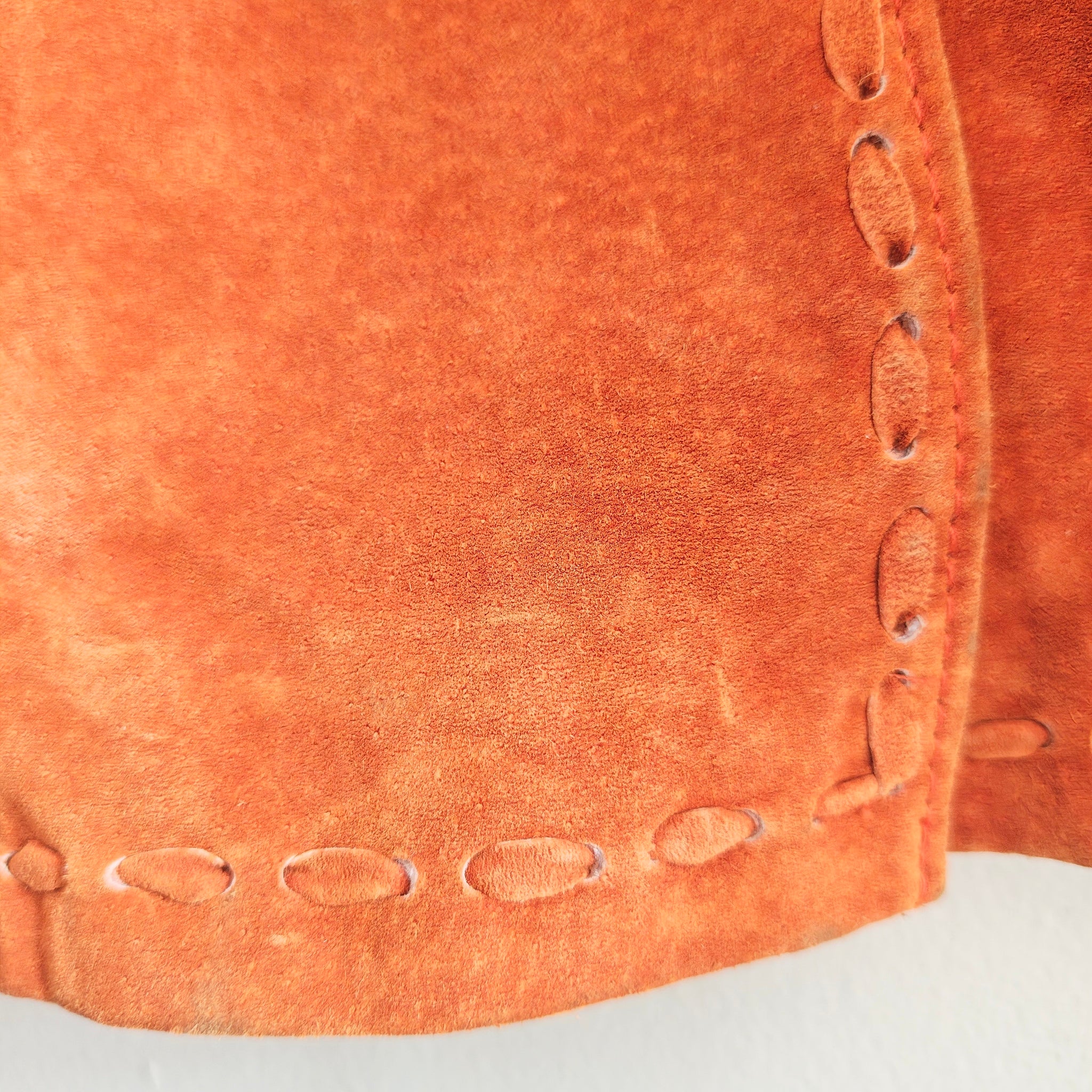 Burnt orange suede leather coat or jacket. It is typically a women's long, button-front, lined jacket with pockets and a collar.