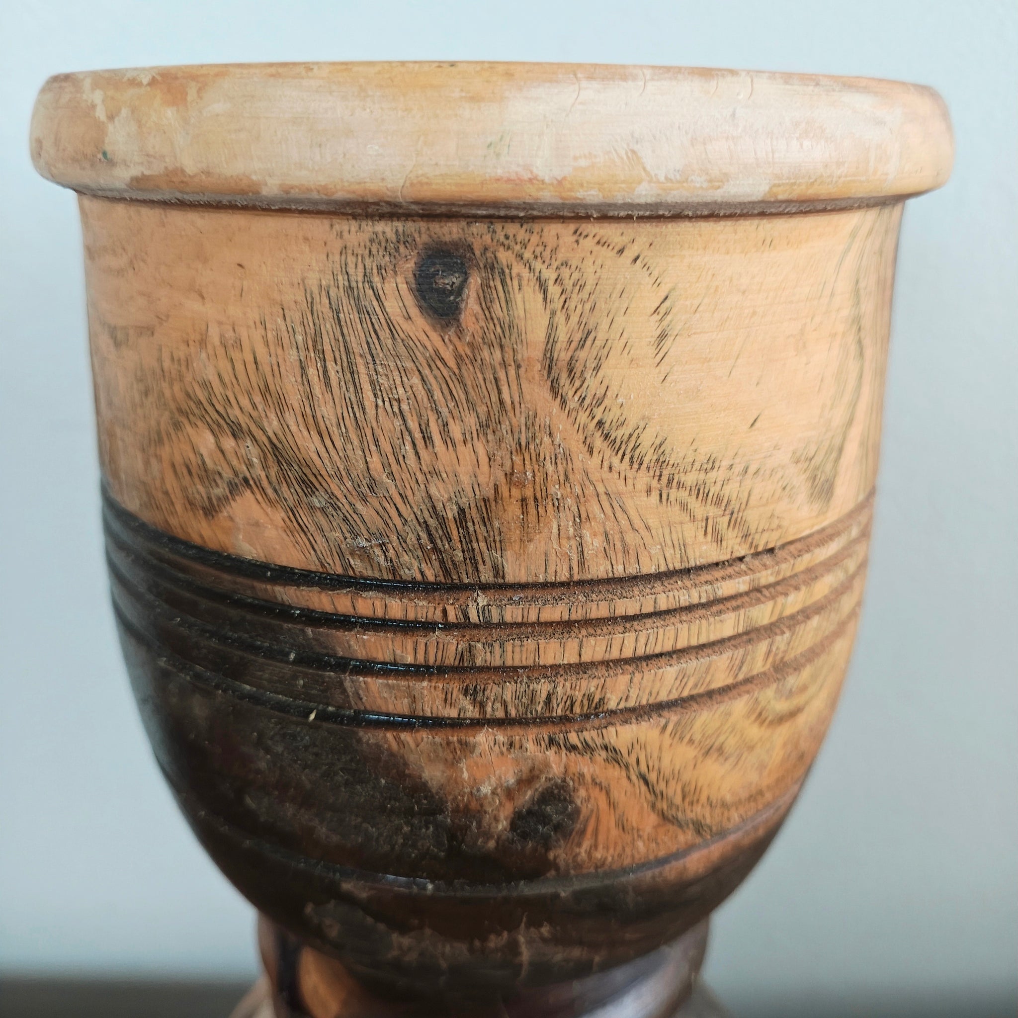 Vintage hand turned wood mortar and pestle set, characterized by its striking natural wood grain and handcrafted design.