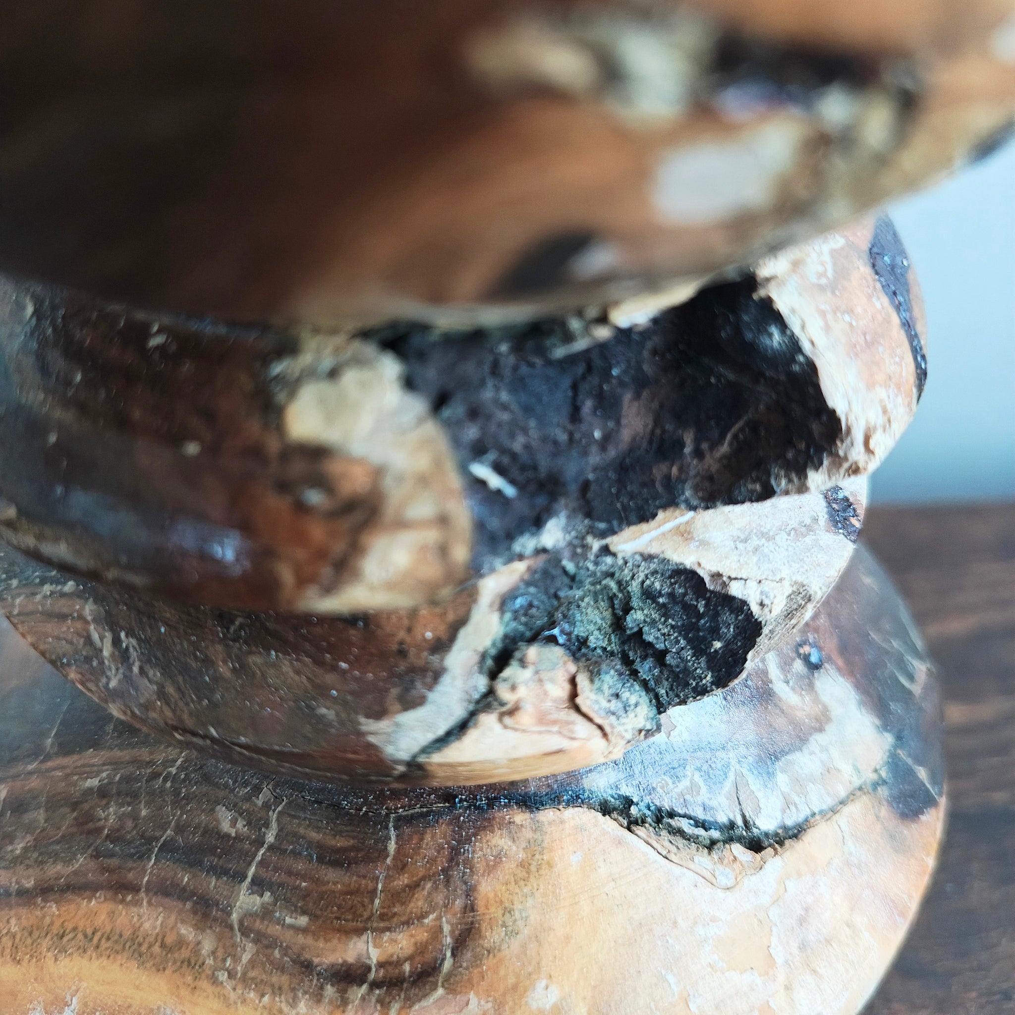 Era: Unknown. 19th Century (Late 1800s) produced many similar heavy, footed examples in dense woods like Lignum Vitae. Mid-20th Century (1950s–1970s) there was a significant revival in artisan-made, hand-turned wooden kitchenware. Items from this era often feature the high-contrast, polished finishes and decorative silhouettes seen here.