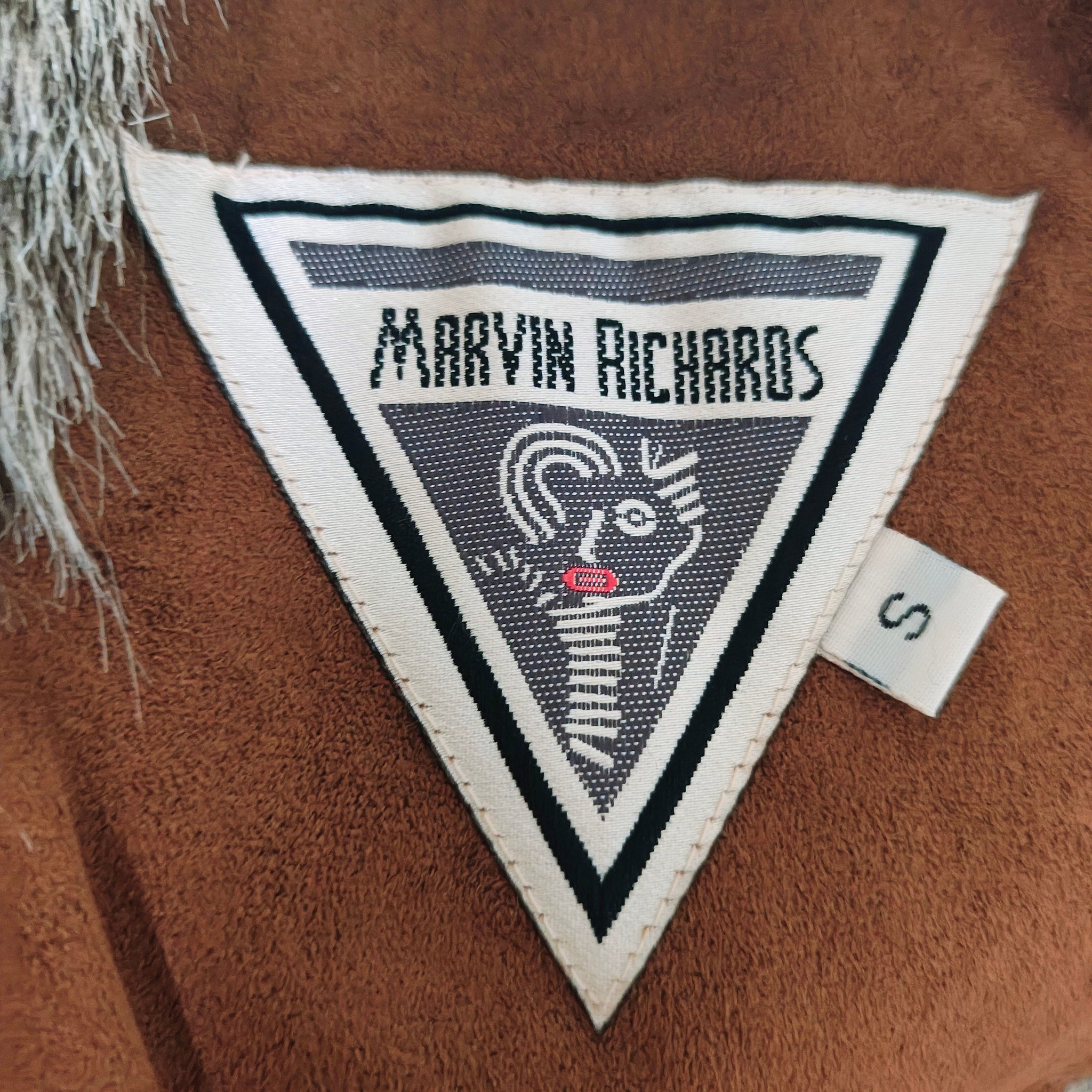 Brown faux suede coat with a plush grey/brown faux fur collar and cuffs, from the brand Marvin Richards. These types of coats, often referred to as Penny Lane style, typically feature a soft lining, button closure, and a mid-length or long silhouette.