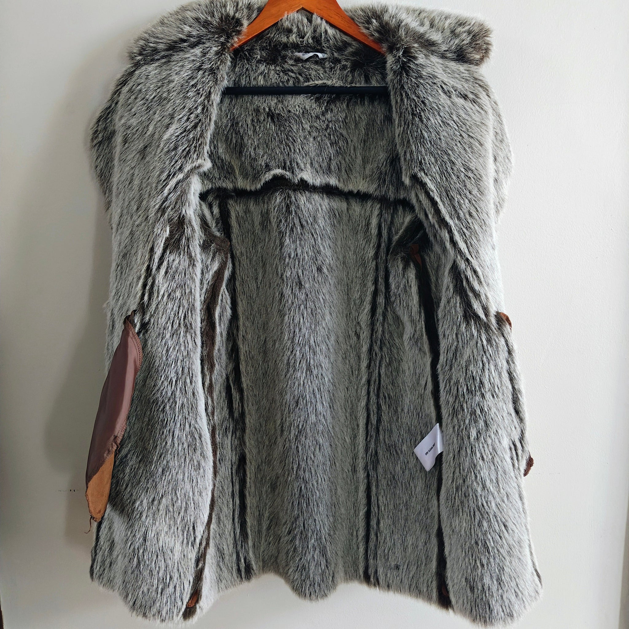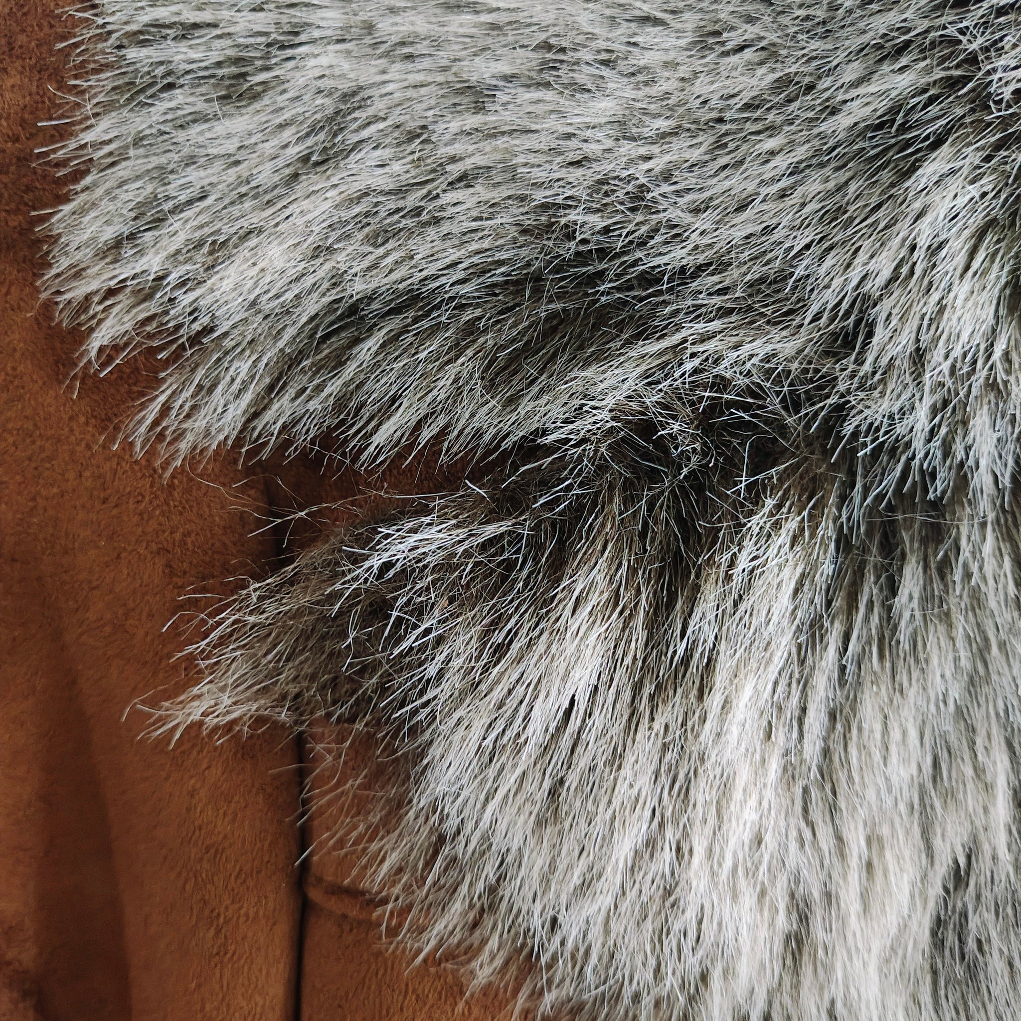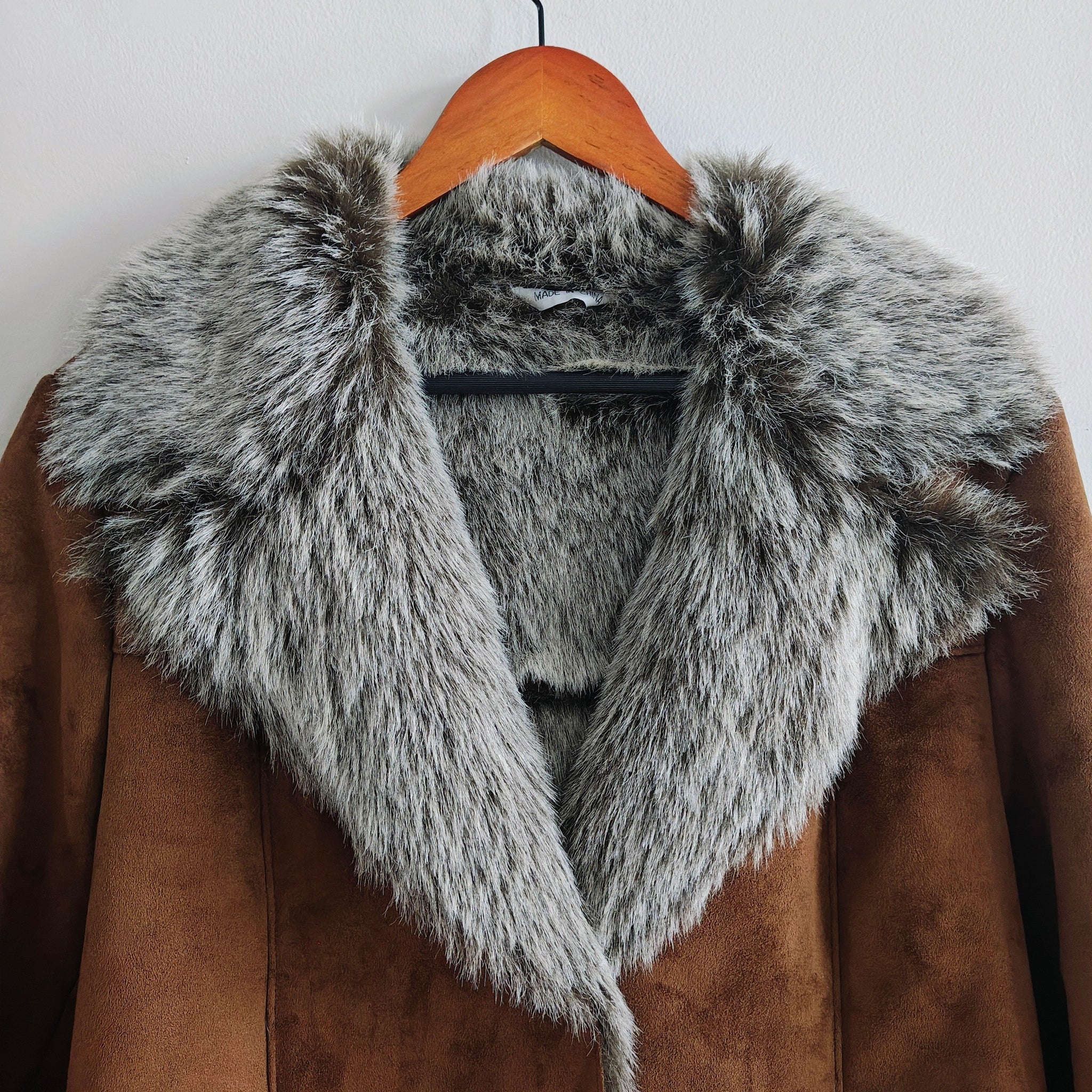 Style: Brown faux suede coat with a faux fur collar and cuffs.