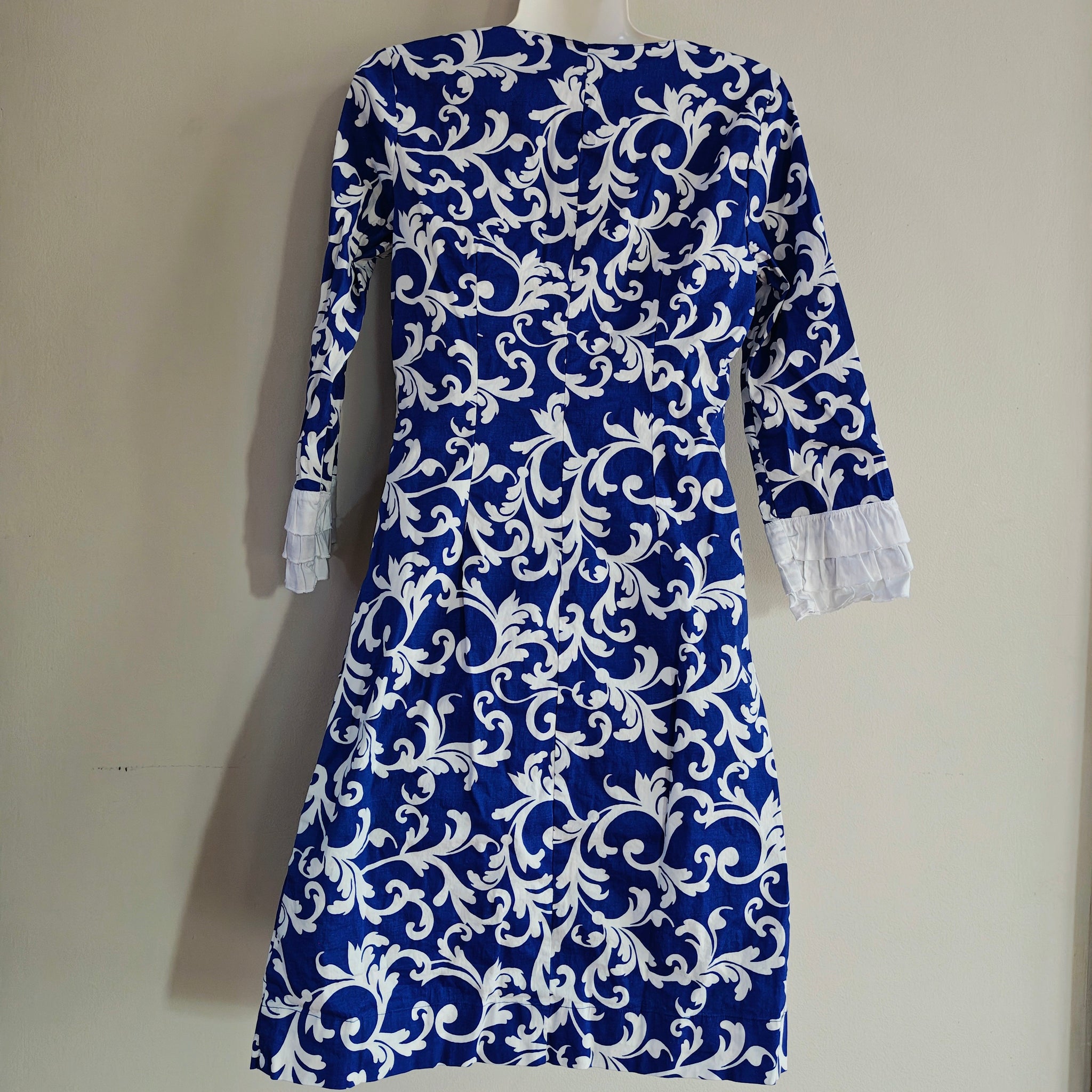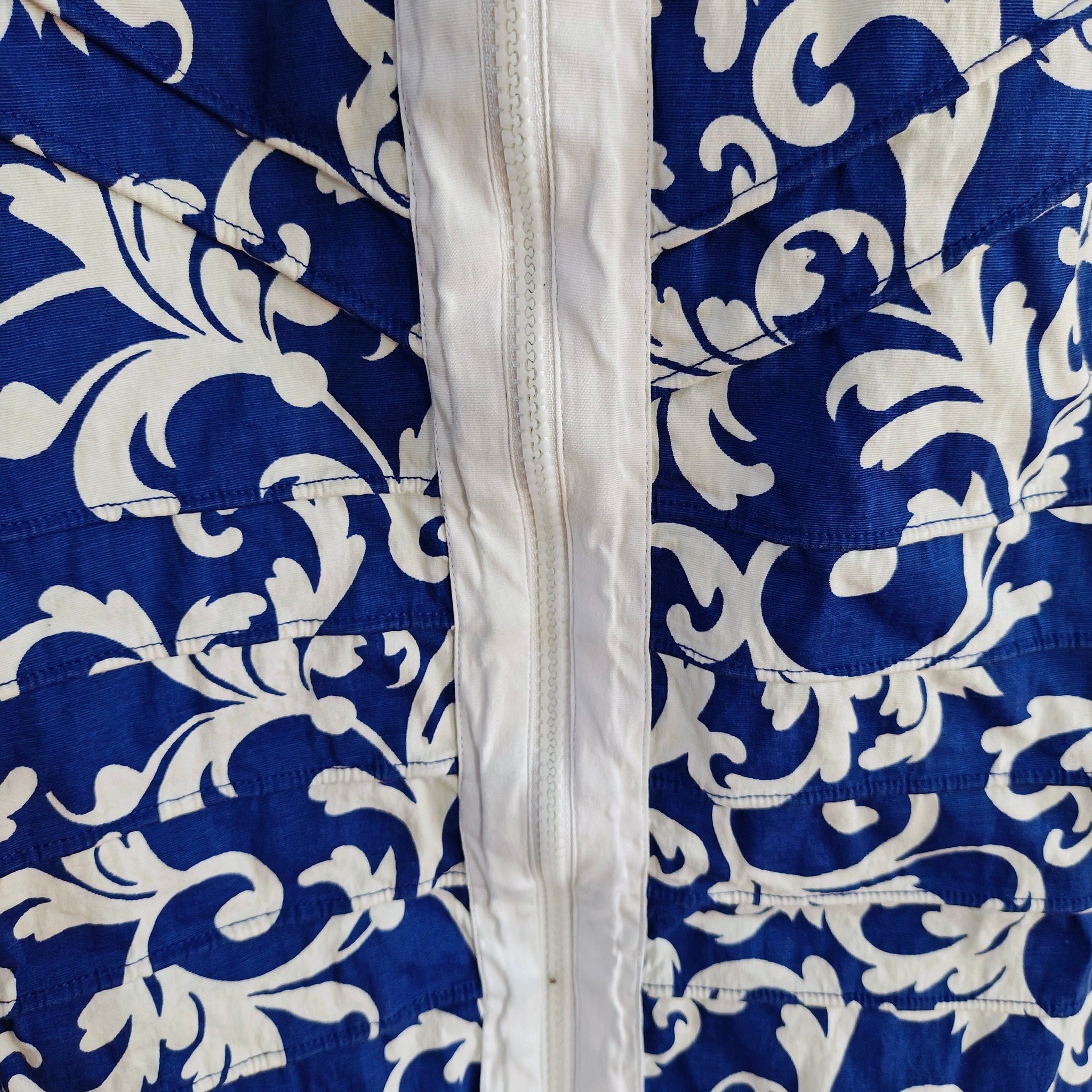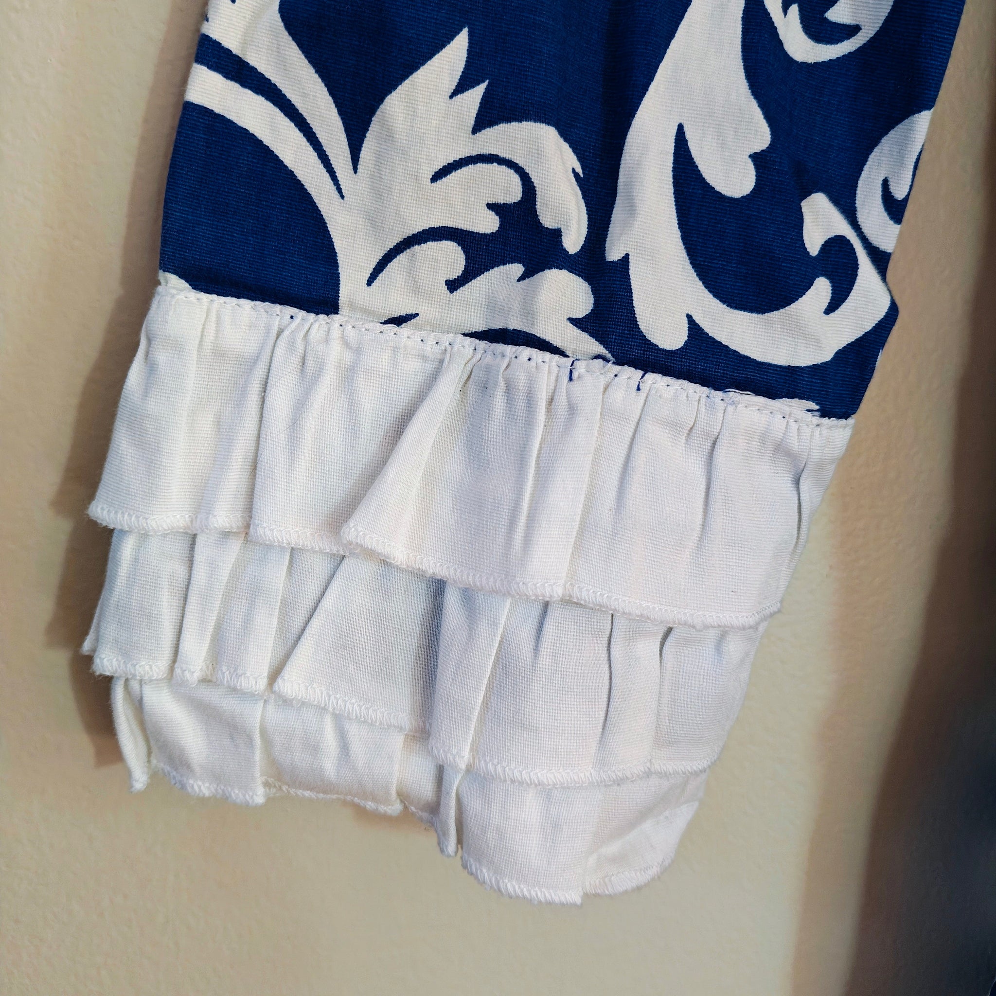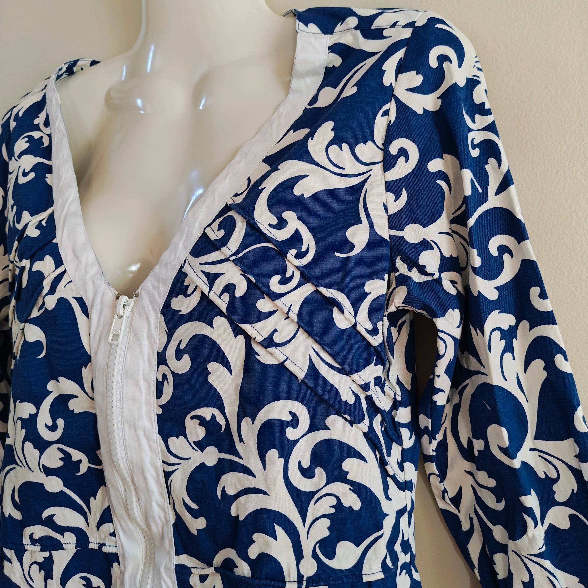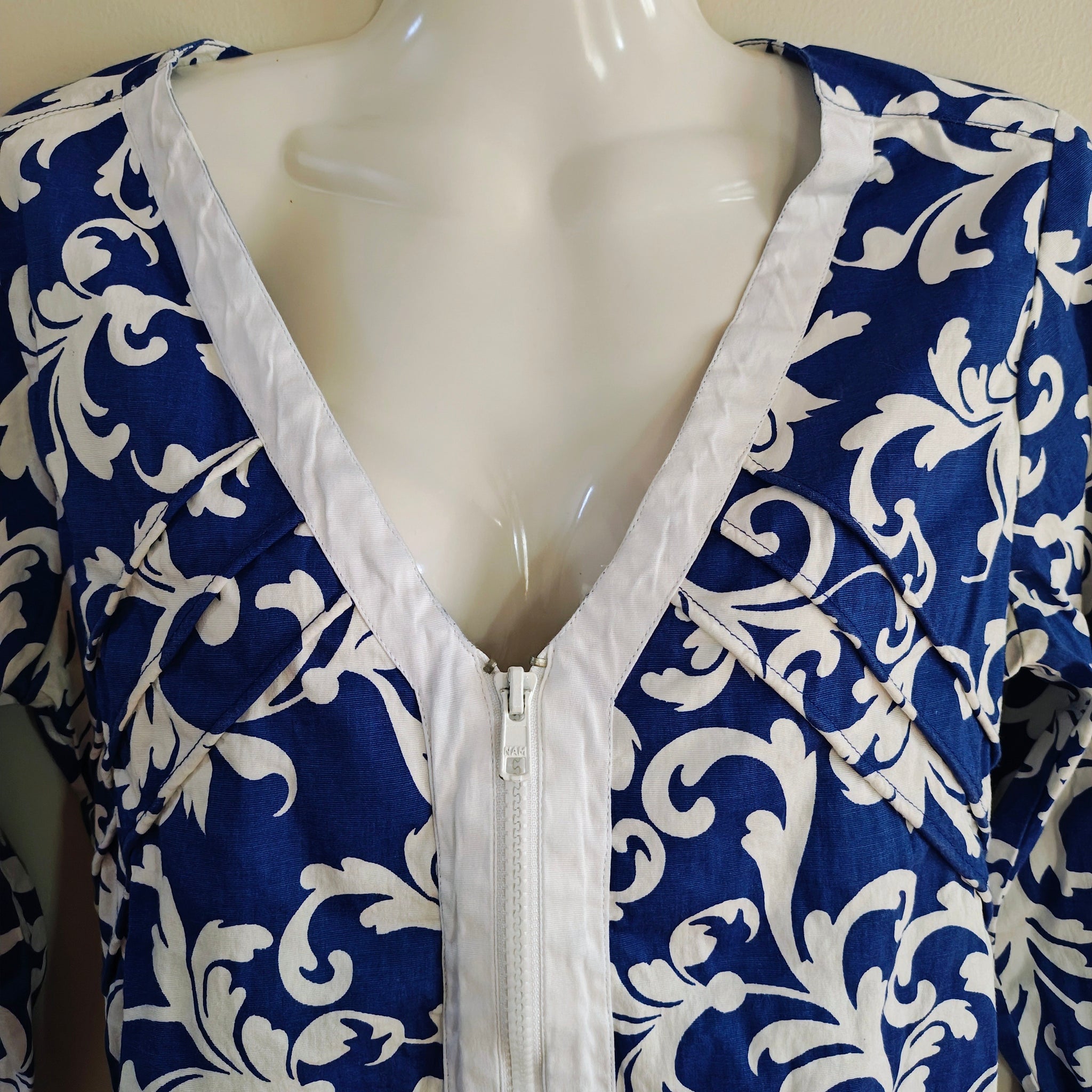 Features: V-neck, front zipper closure, ruffle details on the cuffs and along the zipper placket.
