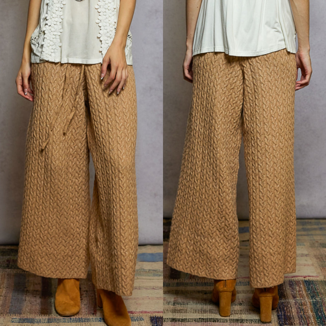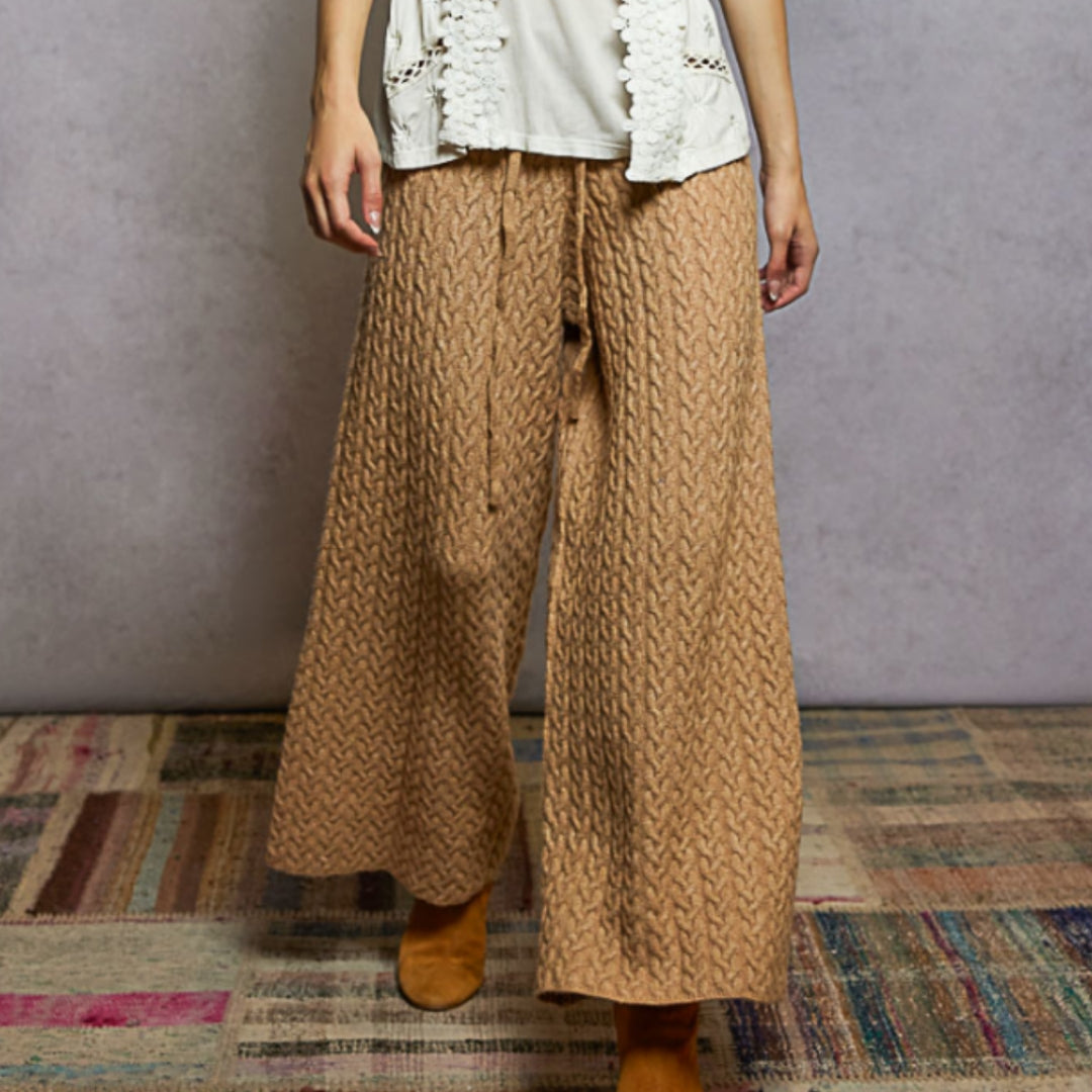 These Wide Leg Knit Pants offer a roomy, comfortable fit with an adjustable drawstring for added convenience. The braided knit adds a stylish touch to these soft and comfortable pants. Perfect for a relaxed yet fashionable look.